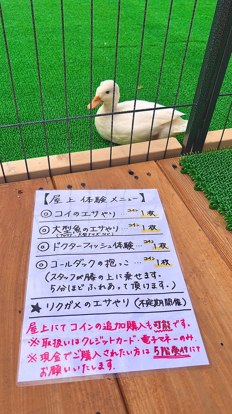 屋上『アヒルのふれあいテラス』では、コールダックとのふれあいや、鯉・カメへの餌やり体験も楽しめ、日常ではなかなか味わえない“生き物とのふれあい”を身近に体験できます。