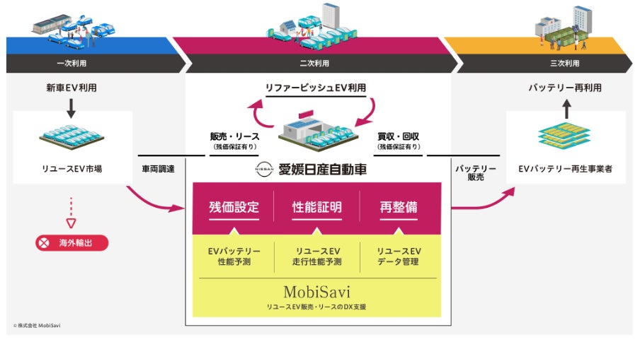 EV性能予測技術等を用いてEVデータ活用事業を運営する株式会社MobiSavi(所在地:神奈川県横浜市、代表取締役社長:左向 貴代、以下 MobiSavi)と、愛媛日産自動車株式会社(所在地:愛媛県松山市:代表取締役社長:岡 豊、以下 愛媛日産)は、EVサーキュラーエコノミー(電気自動車の資源循環)を目指し、リユースEV(中古EV)を用いた新たなEV販売モデル構築に向けた検討を開始しました。