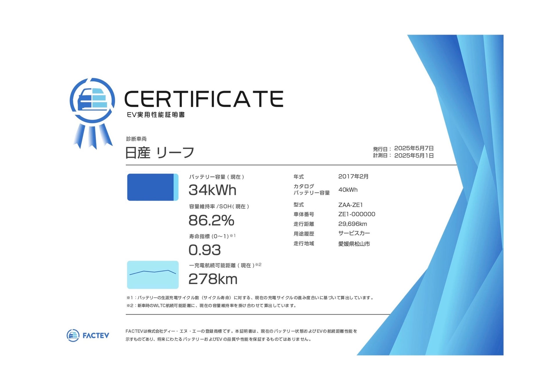 独自技術による分析結果に基づいて、品質・性能を判定し「EV実用性能証明書」を発行