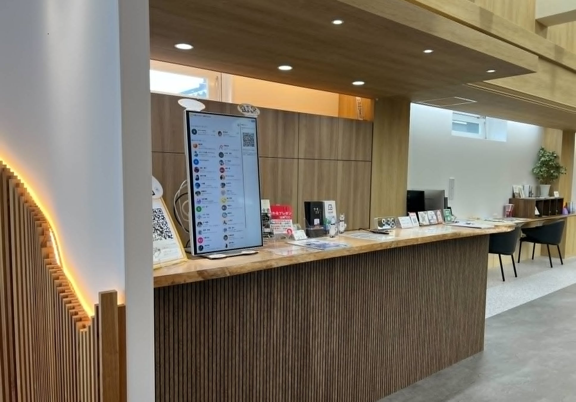 施設の入口、出口、および交流の中心となるエリアに、スマホタッチのできるNFC付きQRコードを配置しました。施設入口に設置された大型サイネージには、現在その場にいるメンバーが持つ「強み」がリアルタイムで映し出されます。 近くにいる方のことを知ることが、とても気軽になりました。