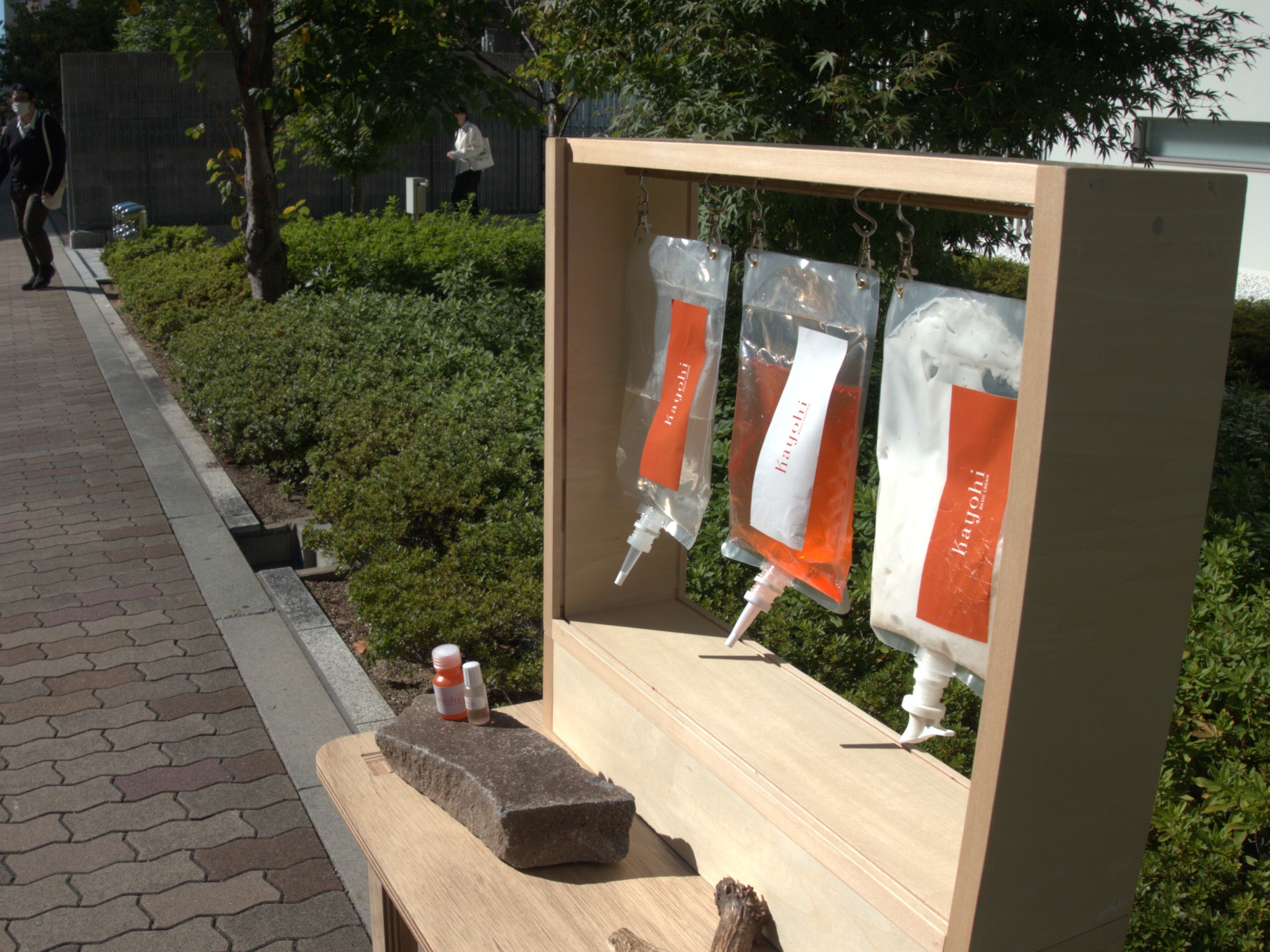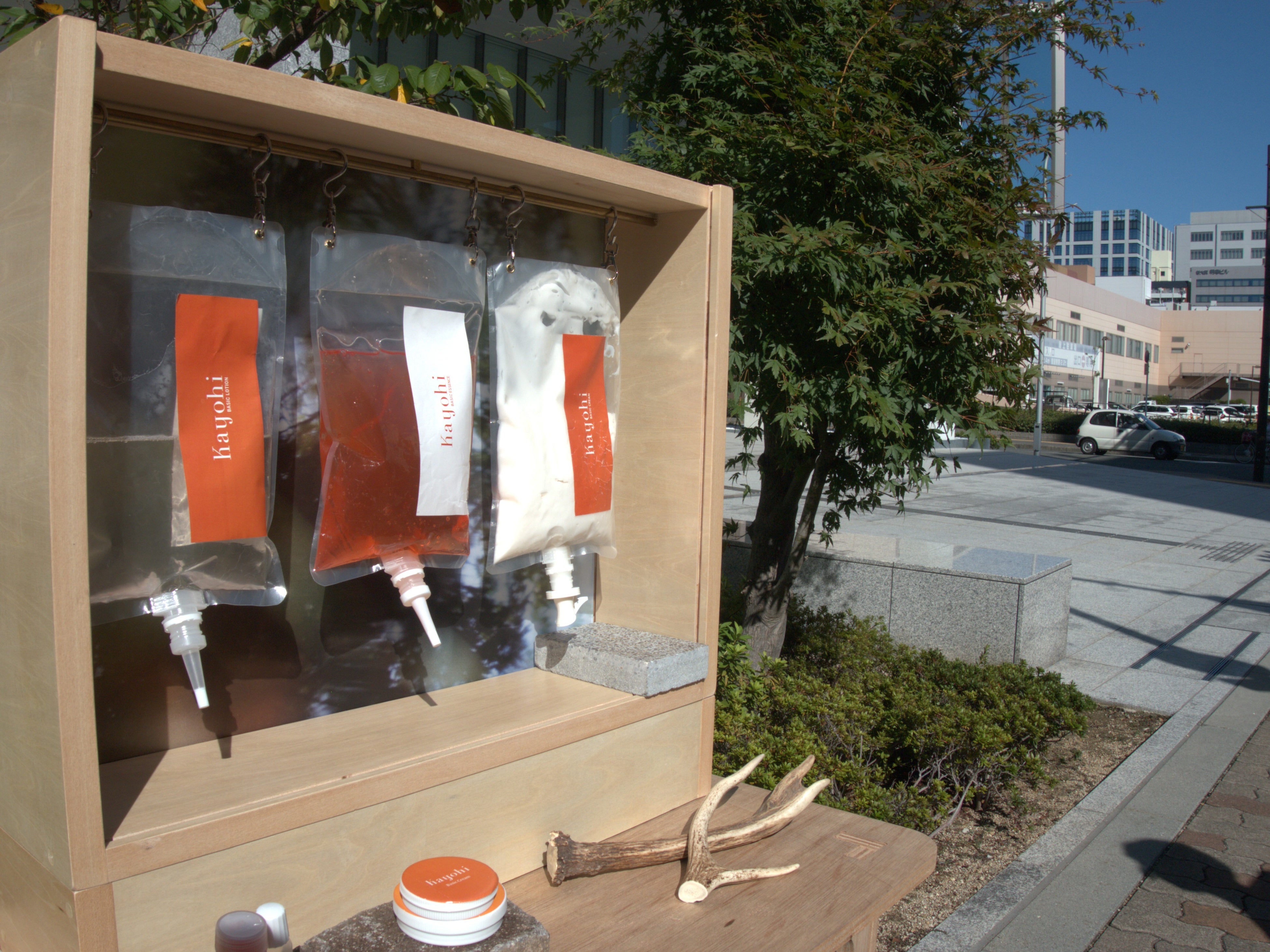 この秋、デザインを担当したのは、化粧品の「量り売り」を通して、人と人、人とモノが長くつながる関係づくりに取り組む、Kayohi合同会社の什器。自然にかかわりが生まれる場をつくるため、量り売り商品を中心とした「人が通い、集まるデザイン」を考案しました。