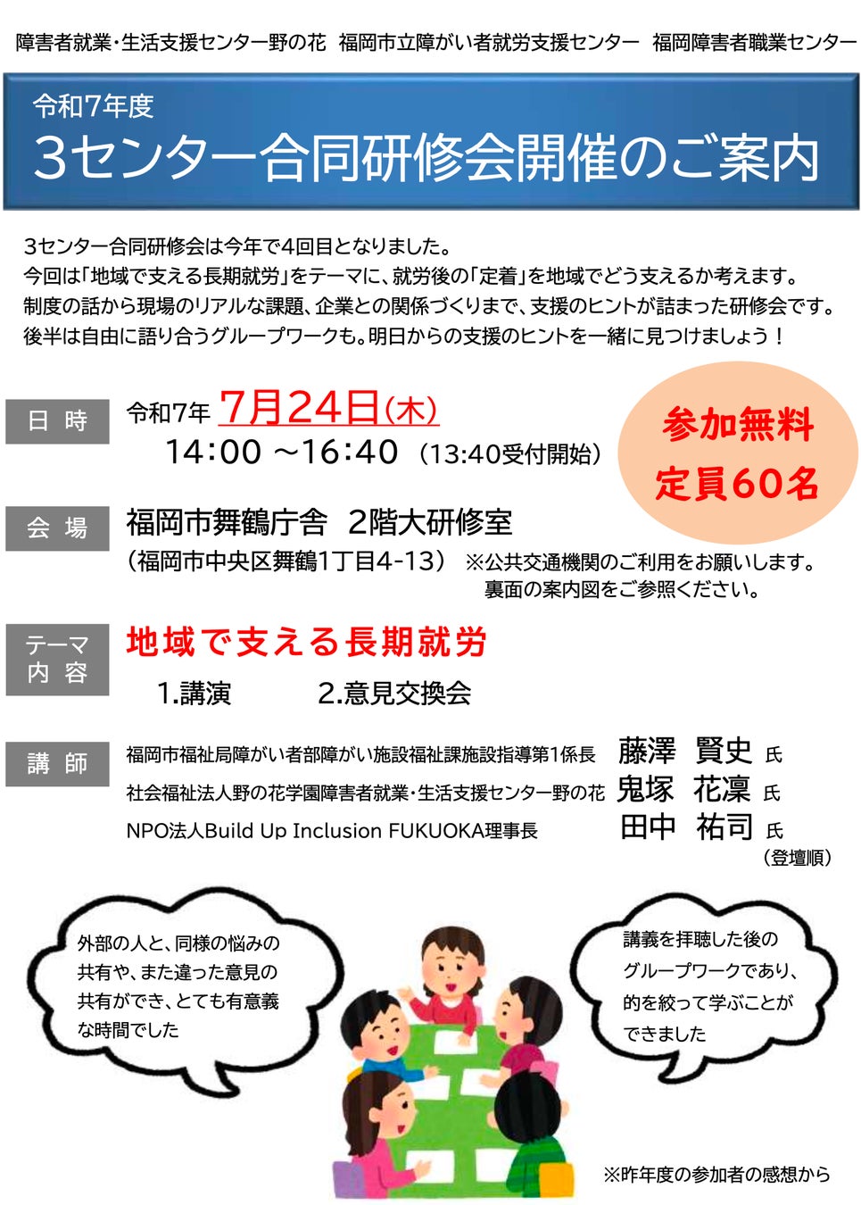 福岡市内で障害者就労支援に取り組む3つの機関(福岡障害者職業センター、福岡市立障がい者就労支援センター、障害者就業・生活支援センター野の花)は、「地域で支える長期就労」をテーマに合同研修会を開催します。