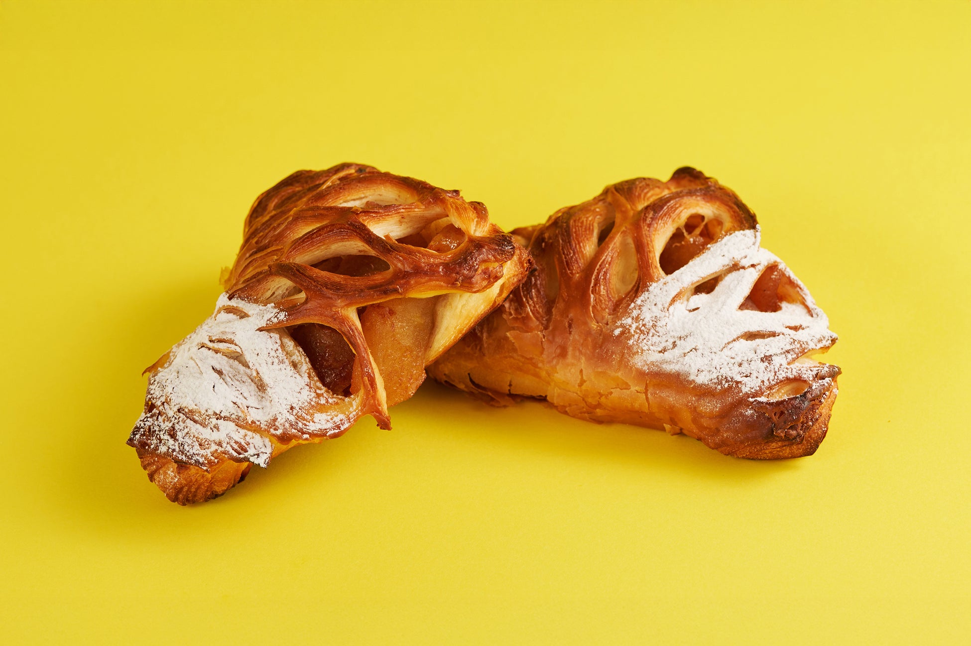 カルヴァドスとシナモンを混ぜたりんごクリームを、パリッとしたデニッシュ生地で包んだ甘さ控えめのアップルパイです。
