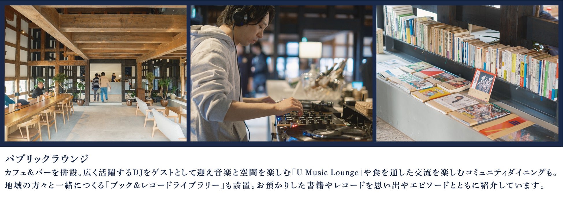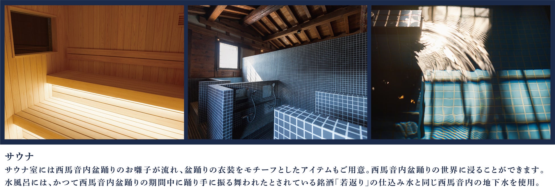 秋田県南特有の建築様式である3つの内蔵は、地域の文化を存分に体感できる客室とサウナへ。西馬音内盆踊りをイメージした幻想的で幽玄なつくりの空間となっています。米蔵は、一族が別荘の庭園を公園として地域に開放していたことから着想を受けて、誰もが自由に使えるカフェ&バー併設のパブリックラウンジとなりました。また、本町通りに面した母屋は、展示やPOPUP、講座などの各種交流ができる地域連携エリアとして開かれています。