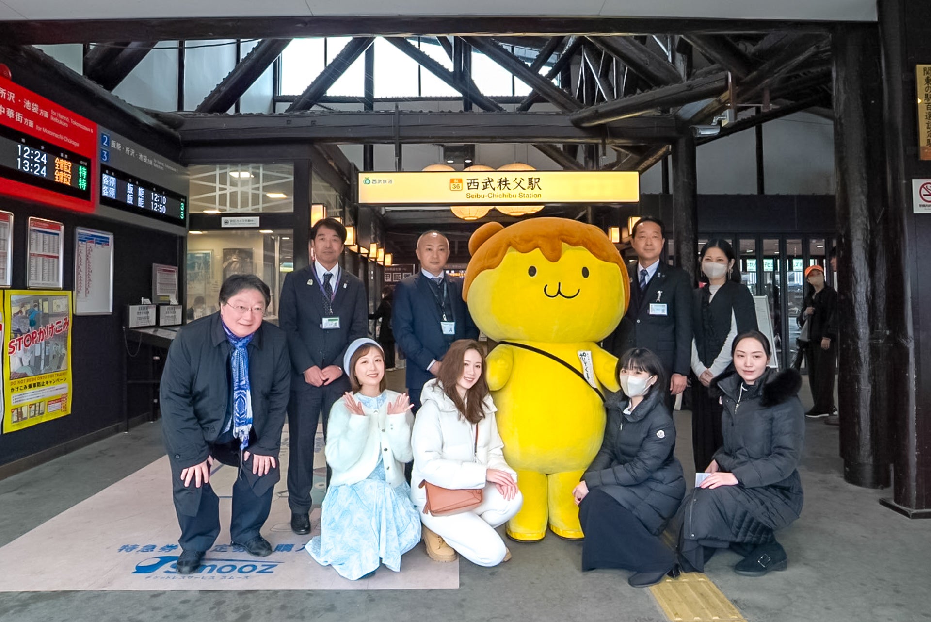 西武秩父駅に到着後、秩父市公式イメージキャラクター「ポテくまくん」の歓迎を受け、和やかな雰囲気で取材活動をスタート。そこから秩父鉄道で長瀞エリアを訪れ、宝登山ロープウェイに乗車。夕方は老舗旅館・長生館内のレストラン「岩ざくら」にて、長瀞渓谷を一望できる開放感のある空間で、名物のぼたん鍋を堪能しました。