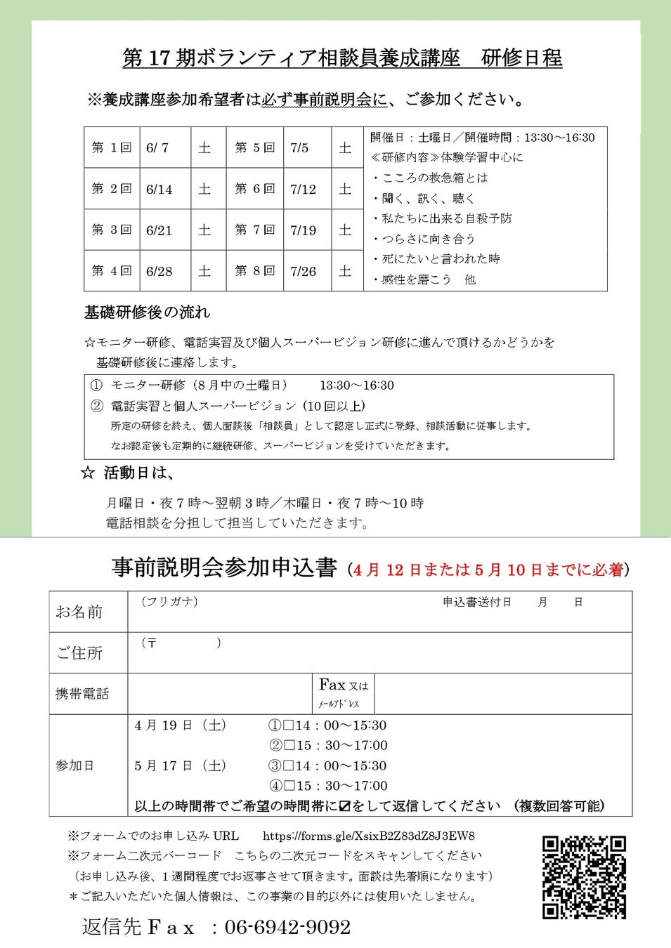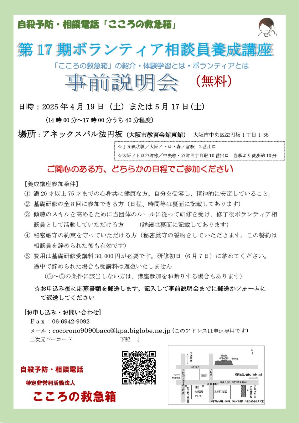 第17期 の 相談員の養成講座を開催します。その参加前の説明会です 自殺予防に向けたボランティア講座を実施します。関心のある方の参加をお待ちしております。