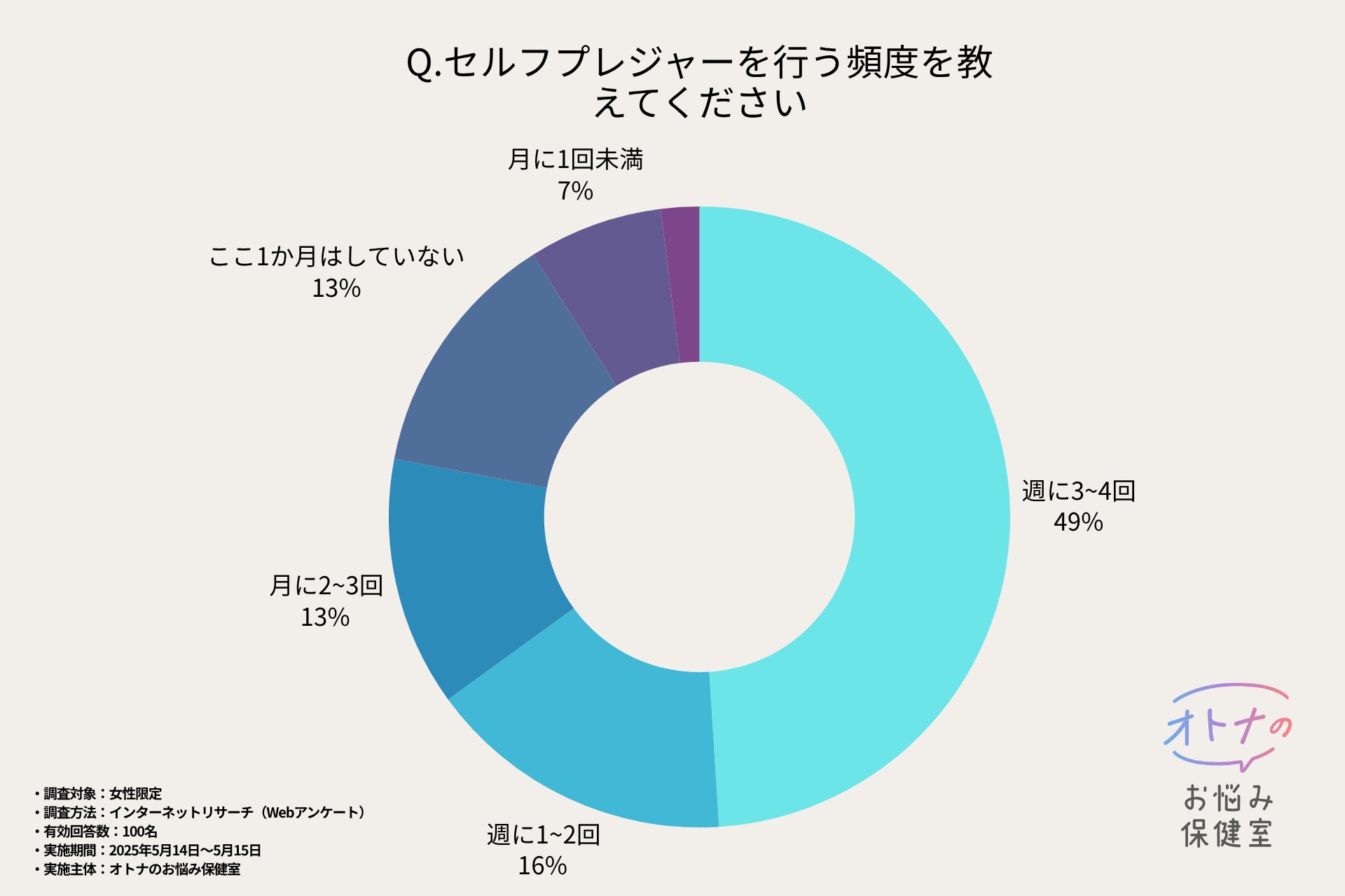 当社が実施した女性限定アンケート(n=100、インターネット調査、2025年5月14〜15日)によると、セルフプレジャーを行う目的は“性欲解消”だけでなく、“リラックス”や“自己理解”など心身のセルフケアの一環として捉える傾向が高まっています。性に関する価値観が「快楽」から「ウェルネス」へと変化しつつあることが示唆されます。約半数が週3〜4回以上。習慣的に行う女性が多数派。