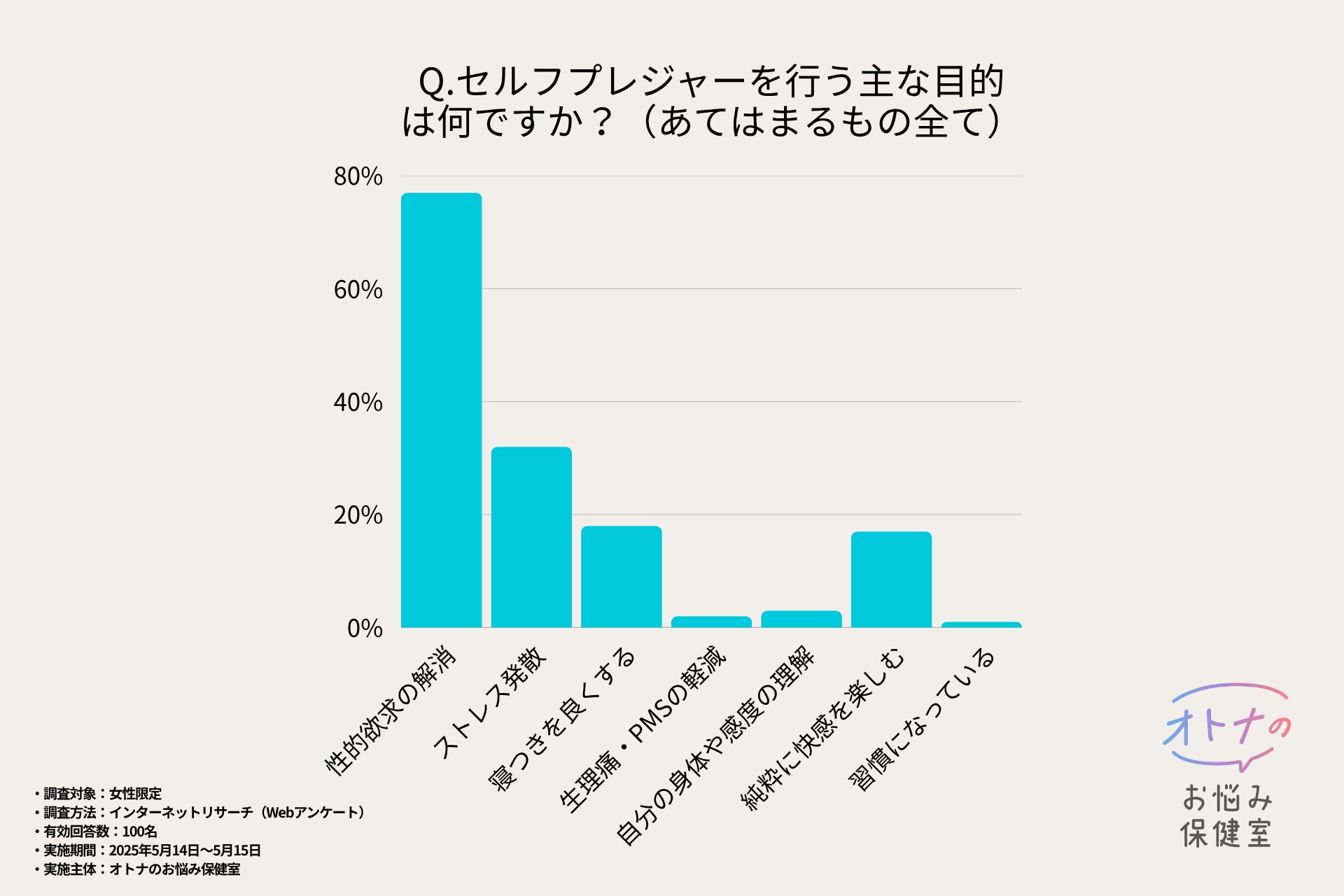 セルフプレジャーを行う目的として、最も多かったのは「性的欲求の解消」(77%)。次いで「ストレス発散」(32%)、「純粋に快感を楽しむ」(17%)、「寝つきを良くする」(18%)が挙がりました。一方で、「自分の身体や感度の理解」(3%)、「生理痛・PMSの軽減」(2%)など、自己理解や健康ケアを目的とする回答も見られ、性行為を“自分を整える時間”として捉える意識が広がっています。