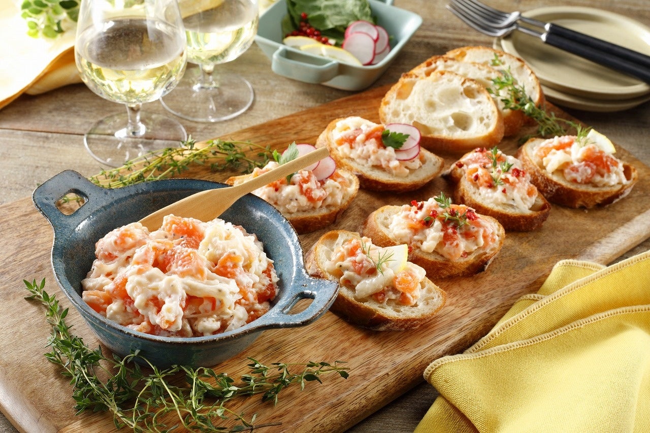 サーモンクリームチーズは、スモークの風味を付けたサーモンに北海道産クリームチーズを加えたサラダです。スライスカットした玉ねぎを配合しており、シャキシャキとした食感もお楽しみいただけます。業務用商品、市販用商品のほか、寿司種規格も販売しています。