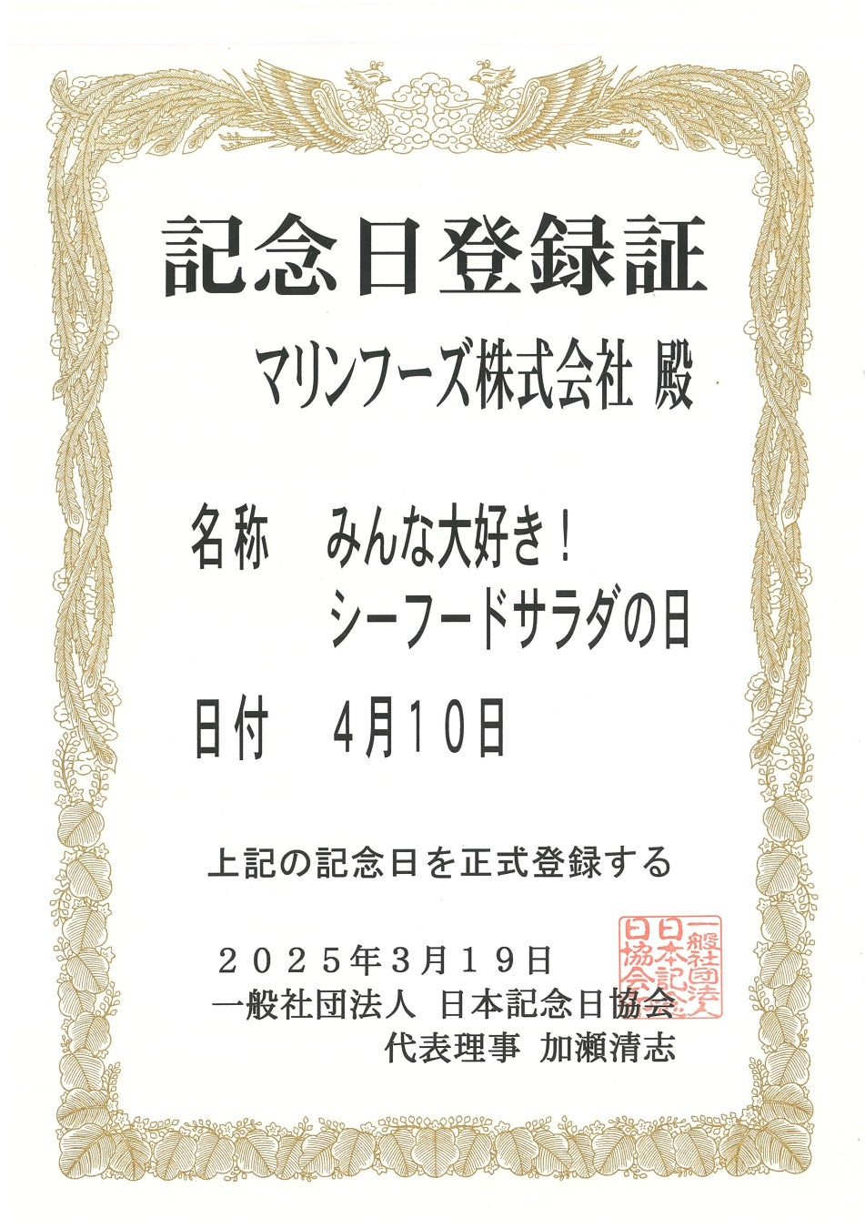 マリンフーズ株式会社(以下マリンフーズ)は、一般社団法人日本記念日協会(以下「日本記念日協会」)の認定を受け、4月10日を「みんな大好き!シーフードサラダの日」と制定しました。
