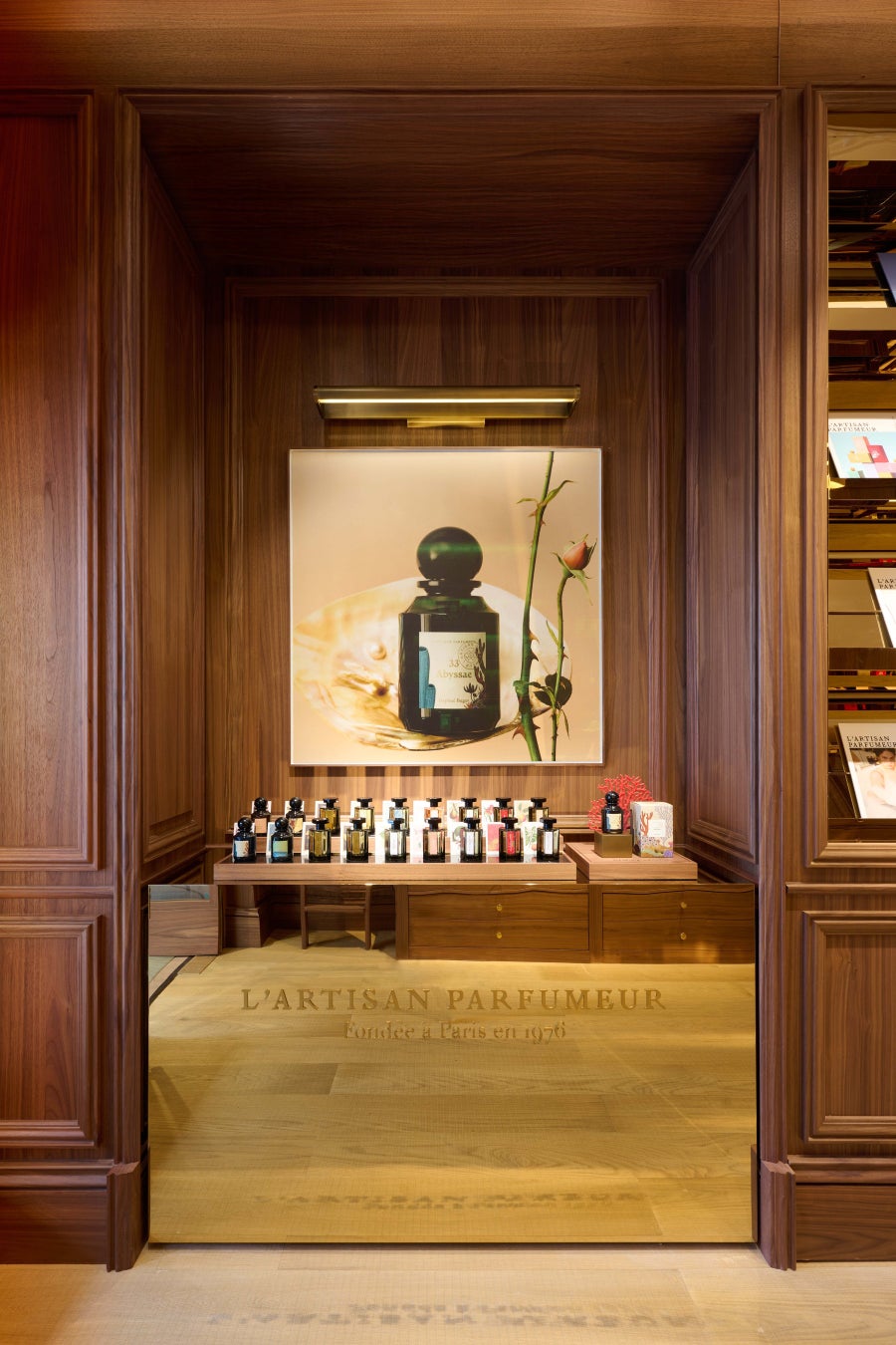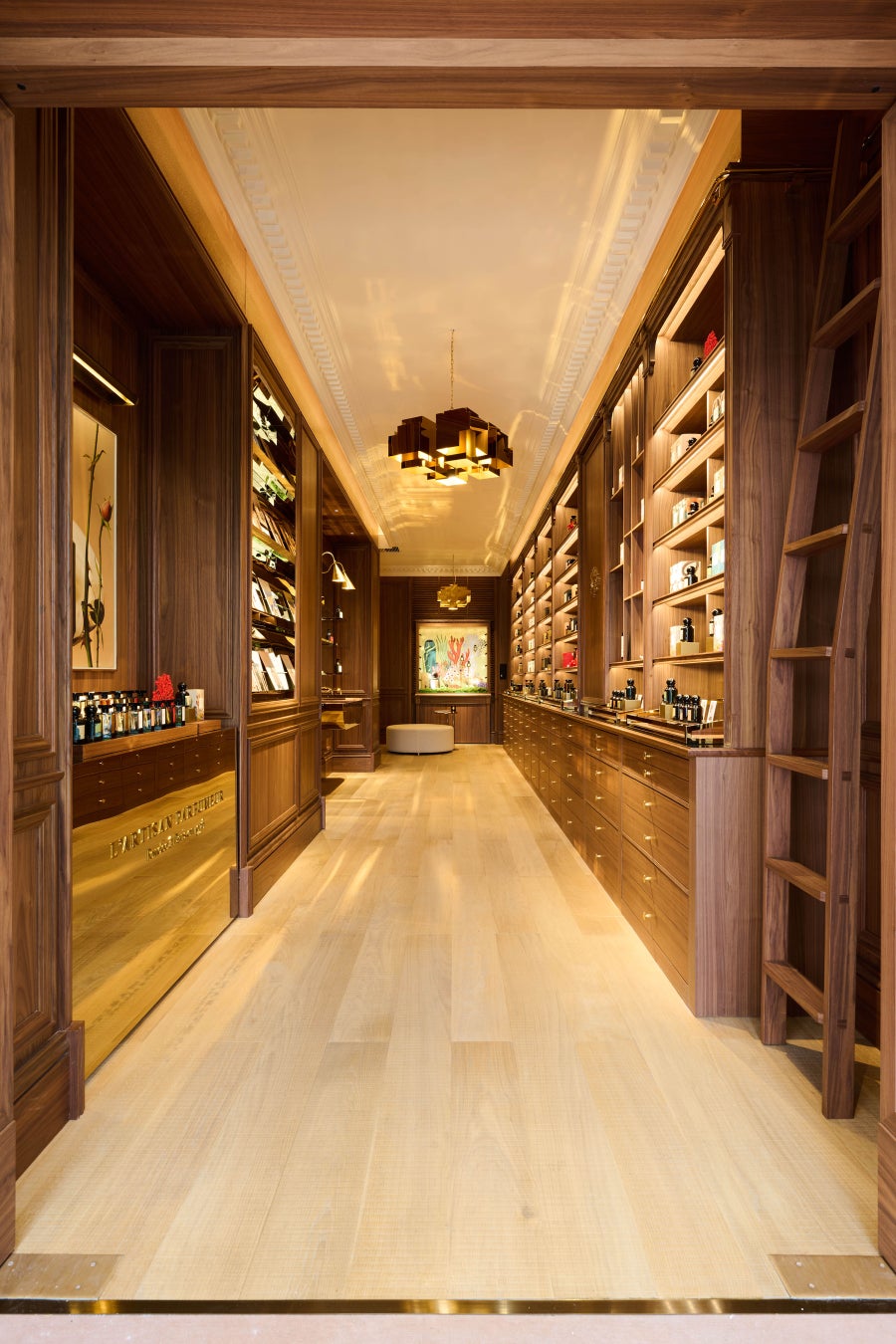 ブランド創業当時1970年台後半のフランスの建築様式とコンテンポラリーなデザインを融合させた内装。素材の美しさを最大限に際立たせるフランスの伝統家具工芸の魅力を感じることができるパリ・サントノレにある本店のコンセプトと同じく、ラルチザン パフューマーの世界に深く浸っていただける店舗となっています。