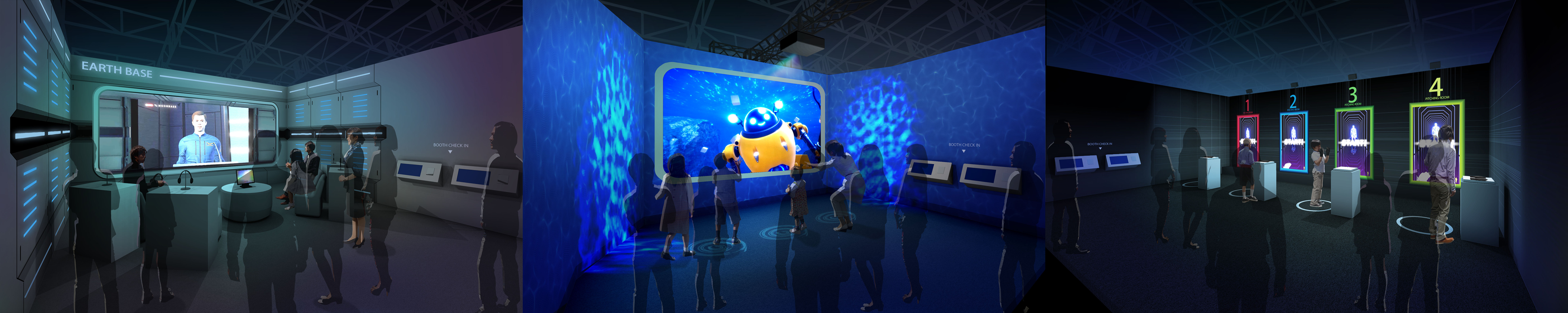 体験ゾーン「未来都市体験エリア+技術体験ブース」では、人類の活動領域の広がりをふまえ、宇宙や上空、海中、仮想空間などを舞台に、Beyond 5Gがもたらす効果を疑似体験できる5つのブースを展開します。