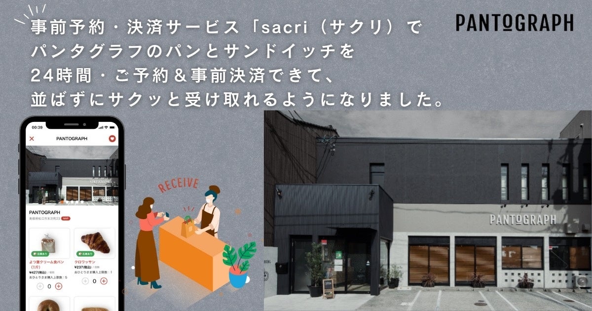 「島根県初」パンタグラフではお客様の混雑解消に向けて、24時間100種類以上のパン、サンドイッチの事前予約・決済サービスsacri(サクリ)を導入。レジに並ばず商品お渡し、スムーズにお買い物が可能に。