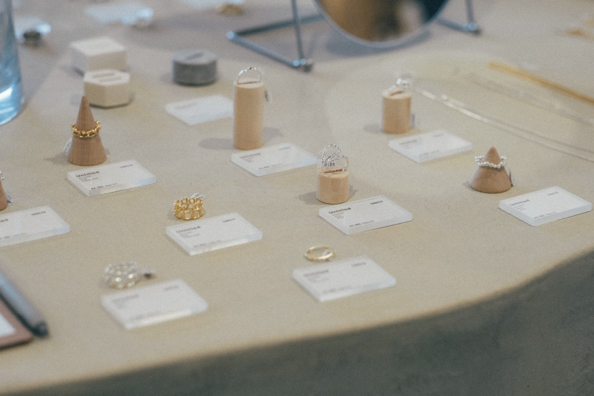 オンラインでは難しい着用感やサイズ感を、実際に手に取ってお確かめいただけます。サイズ調整可能なリングやピアス、バングルなど、日常使いしやすいデザインを多数ご用意しています。