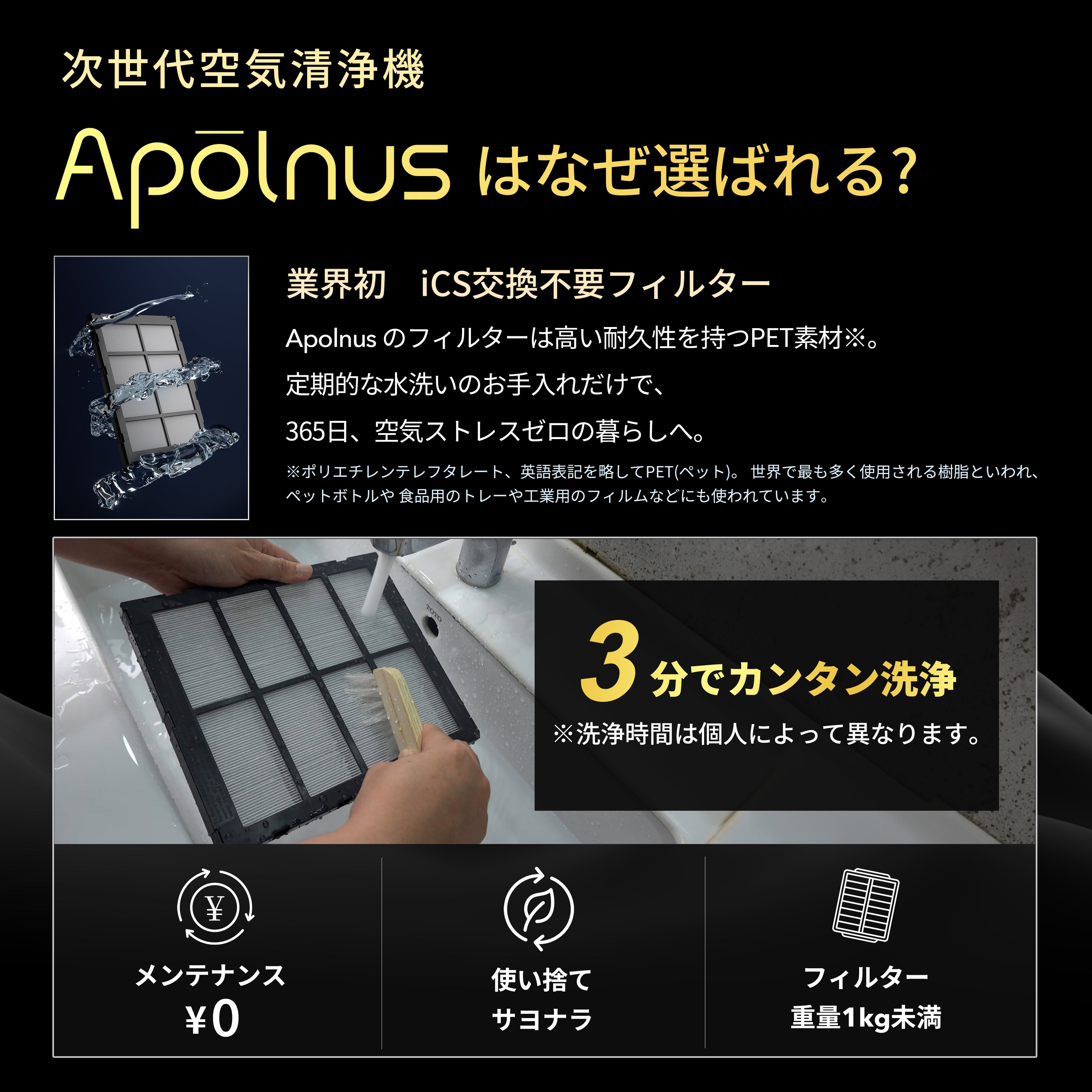 Apolnus Japanは持続可能性を追求した空気浄化ソリューションの開発に注力し、「フィルター交換不要」の革新的な設計で環境への負荷を軽減します。環境に配慮しながら、上質なライフスタイルを求める消費者に、快適で健康的な暮らしを提供することを目指しています。