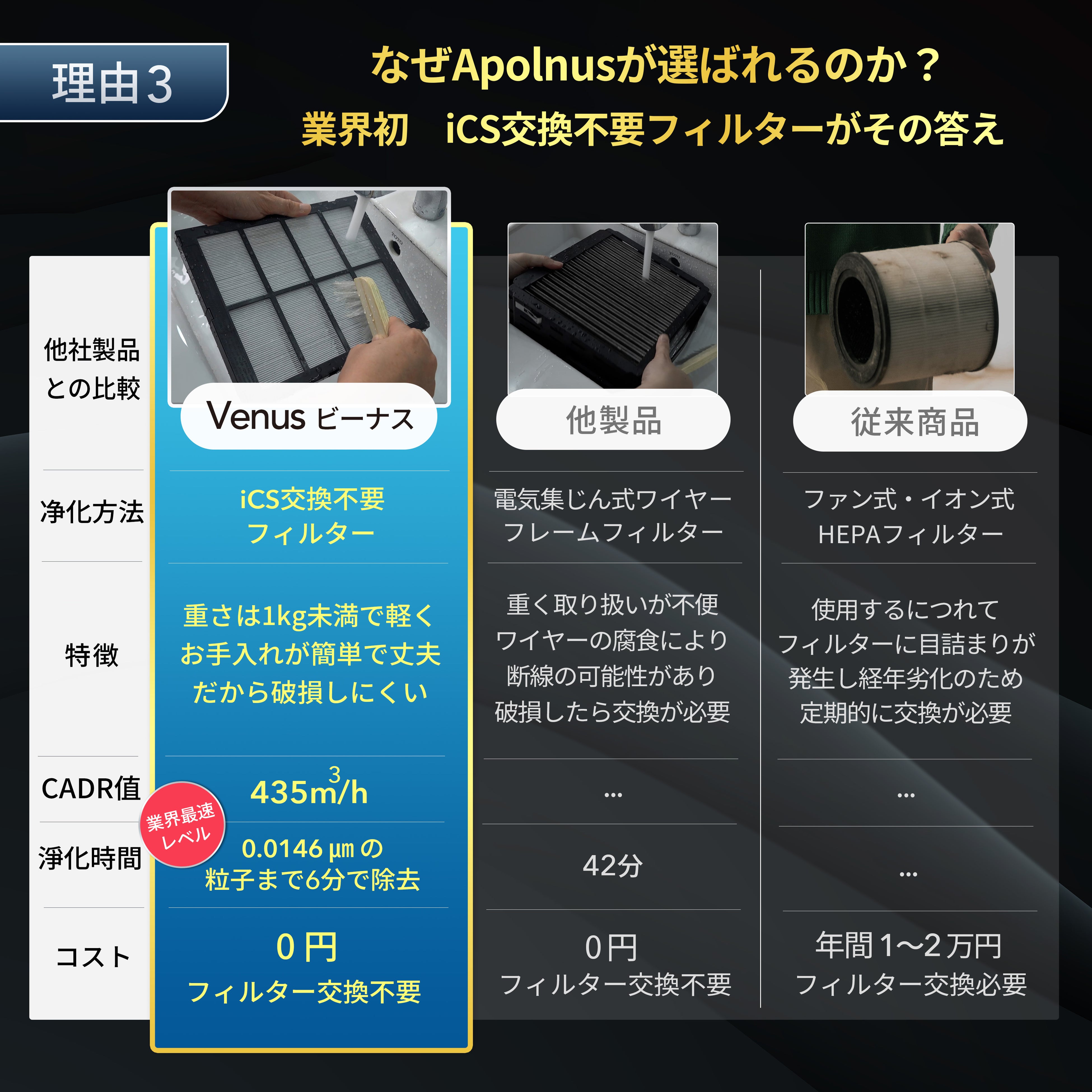 株式会社ジョーステック(本社:東京都江戸川区)は、春の花粉と黄砂のピークに合わせて、2025年4月7日にAmazonで台湾発のApolnus(読み:アポルナス)フィルター交換不要の空気清浄機「Venus」を発売しました。花粉症に悩む約5000万人の日本人や、黄砂で呼吸が気になる家族に向け、独自のICS静電集塵技術で99.9%の花粉とPM2.5をスピード除去します。10mパワフル気流で送風ファンとしても使える。経済的で環境に優しい設計で、家族の健康と笑顔を守ります。