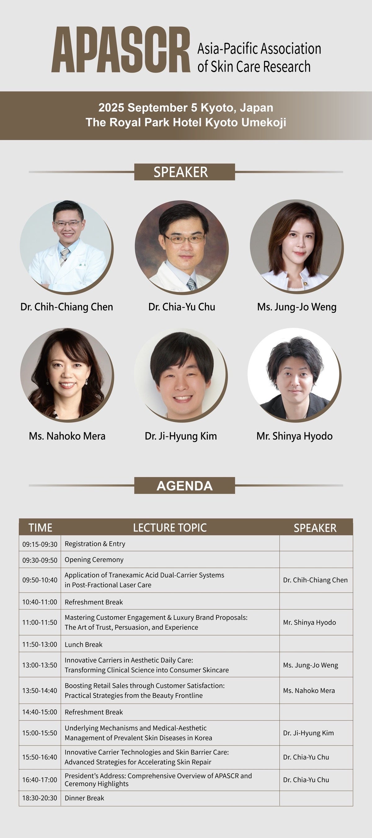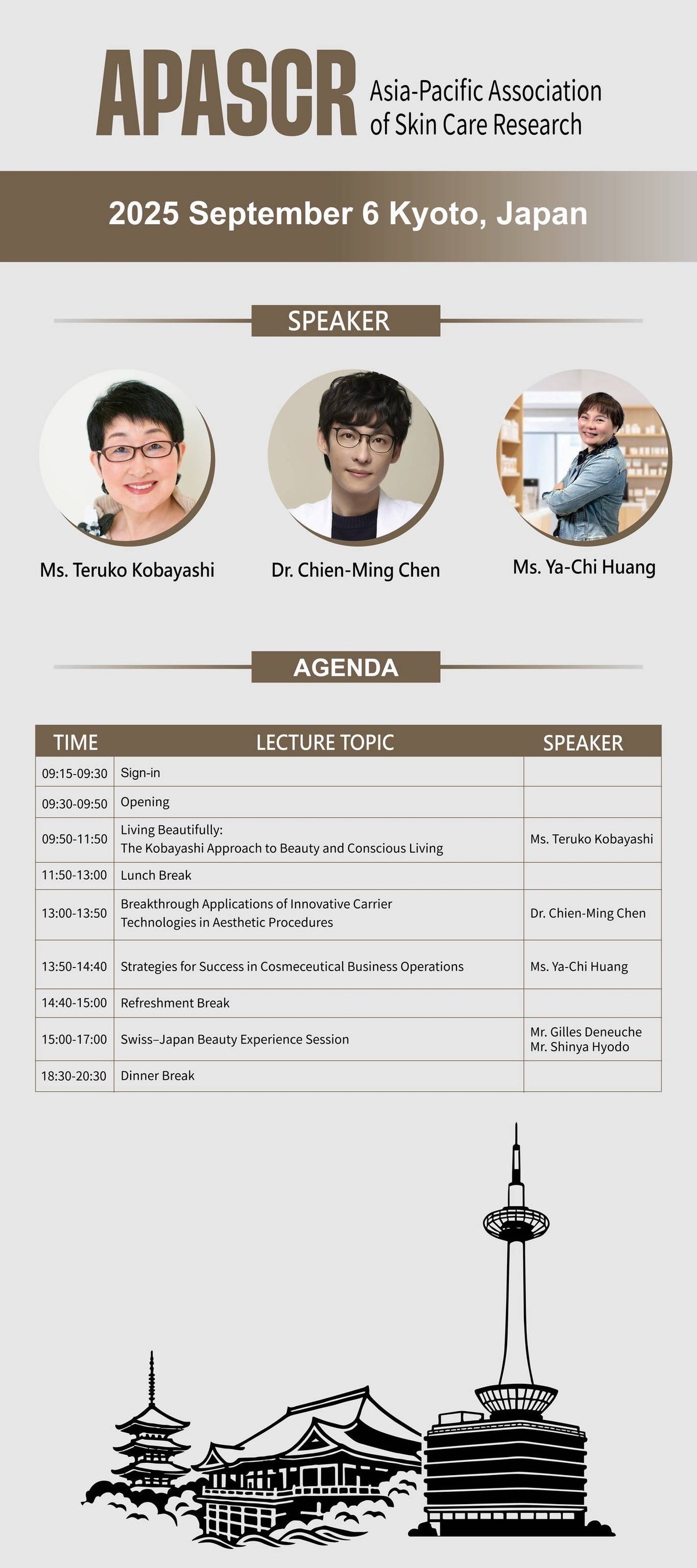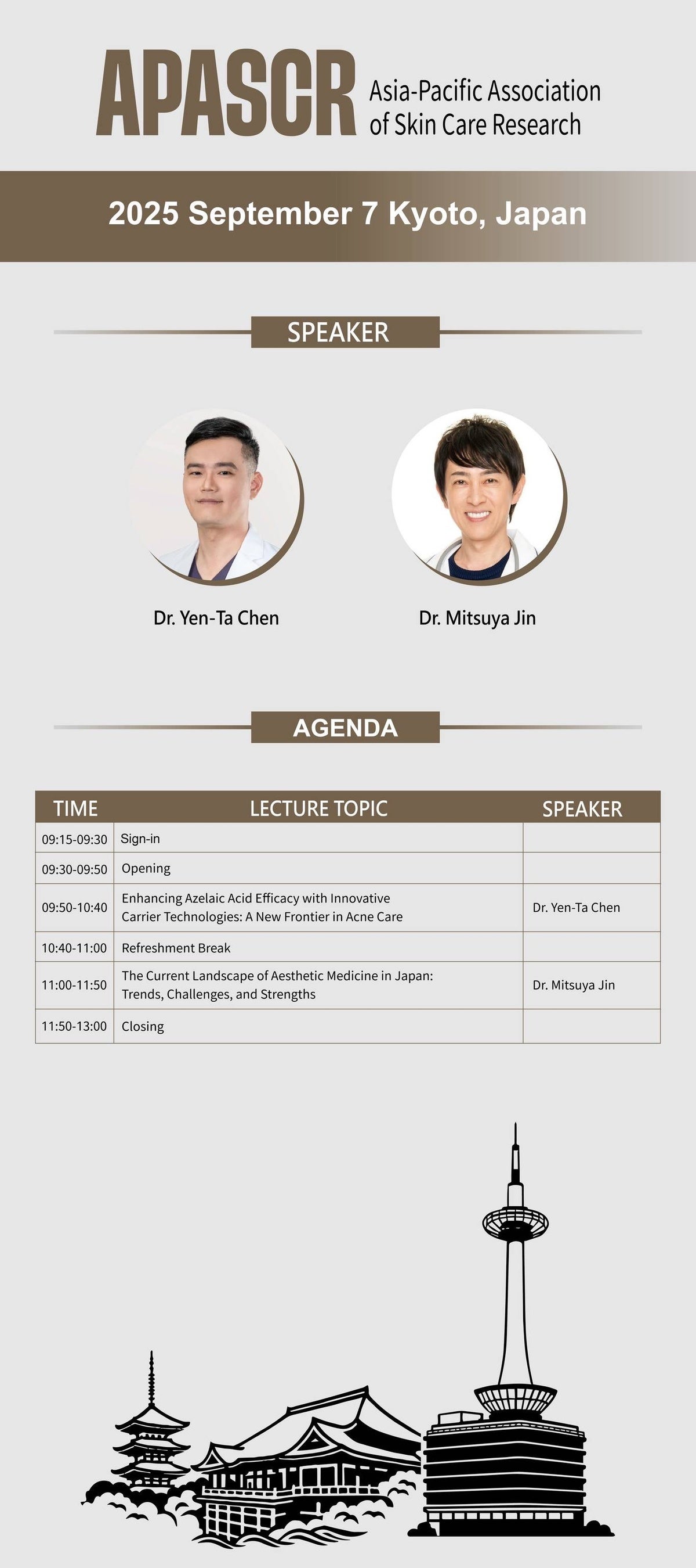 本シンポジウムは「Innovative Delivery Systems × Clinical Application × Market Integration(革新的キャリアシステム × 臨床応用 × 市場統合)」をテーマに、日本・スイス・台湾・韓国から著名な医師・研究者・美容業界リーダーが集結。最新の研究成果と臨床応用、産業界の展望を共有し、アジア太平洋地域における国際学術交流の新たな拠点を築きます。