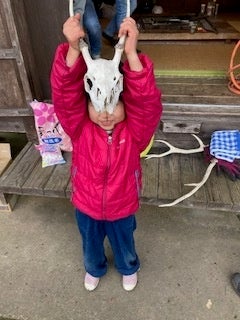 子どもが鹿肉を口にし、親が「命をいただく」という意味を伝える。
