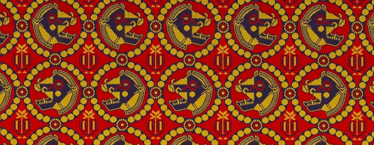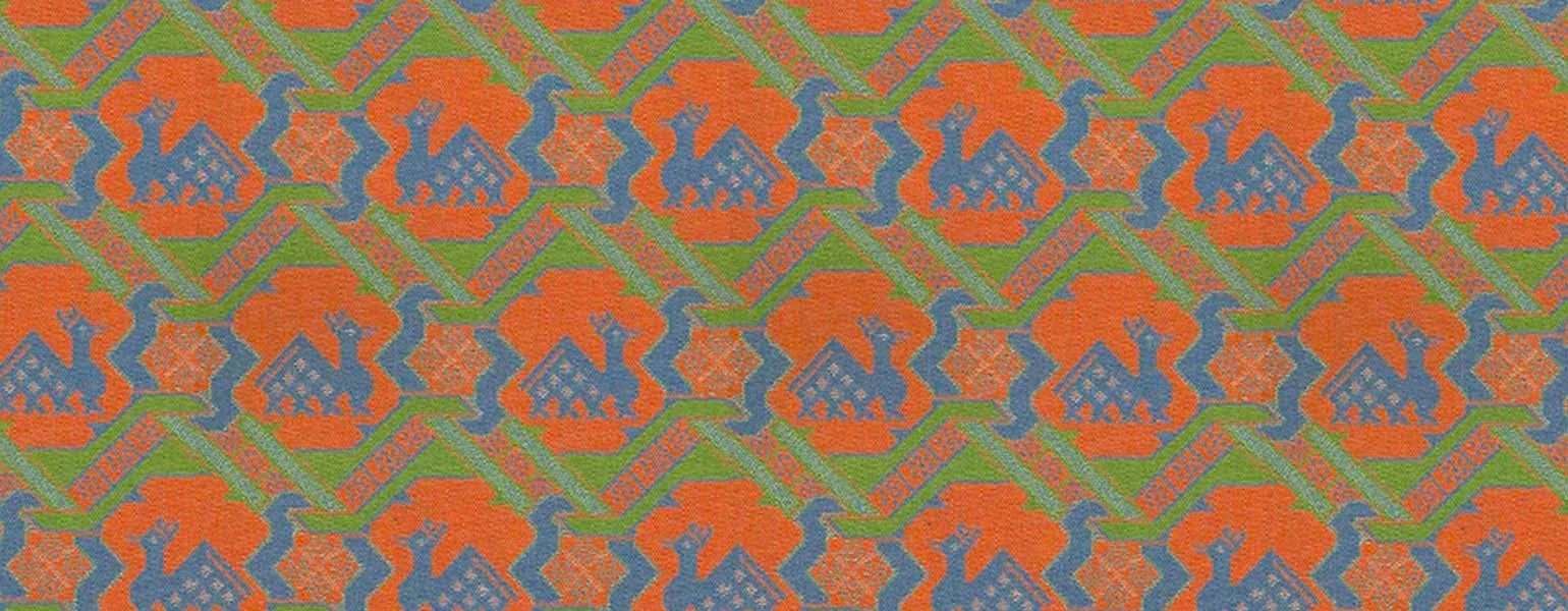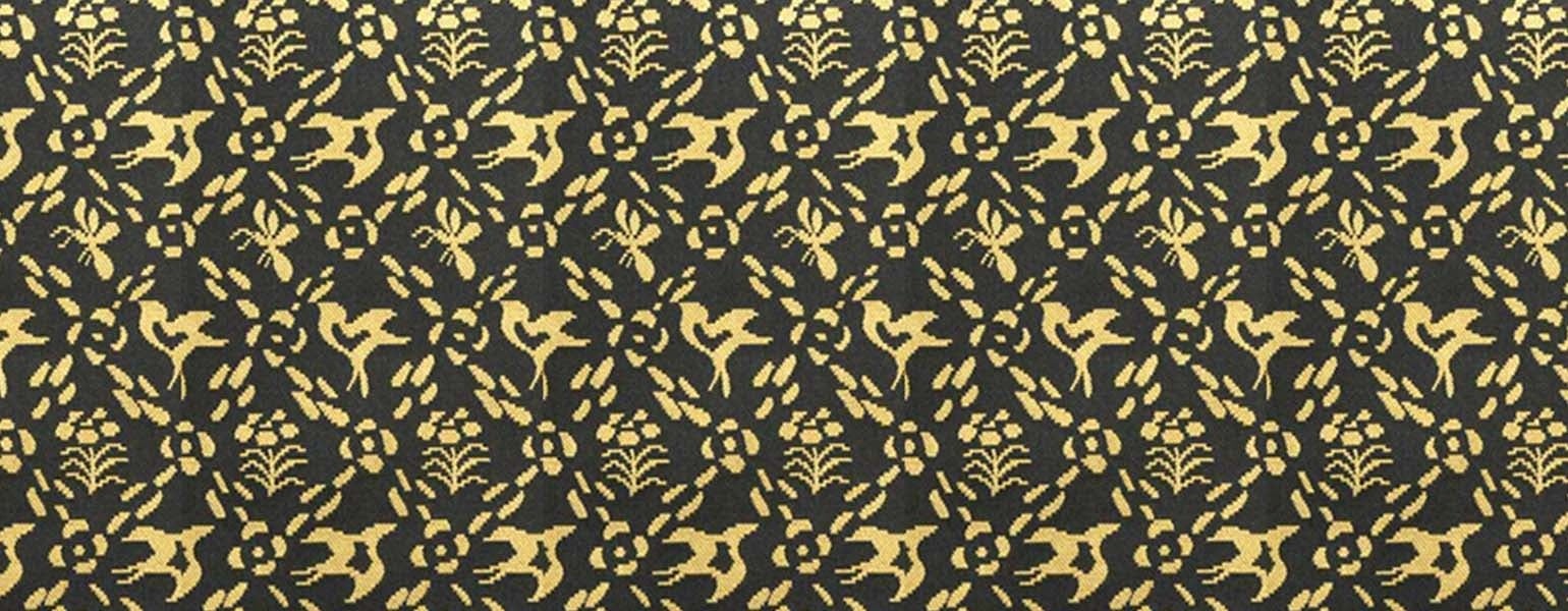 唐代シルクロードの時代に作られた絹織物で、現在の中国・トルファン近くの遺跡から出土しました。ニューデリー博物館にある同様の模様をもとに、文様の向きを交互に変えて織られています。猪の頭をかたどった模様が特徴で、力強い動物の姿が表現されており、古代ペルシャの芸術を思わせる重厚な雰囲気を持っています。
