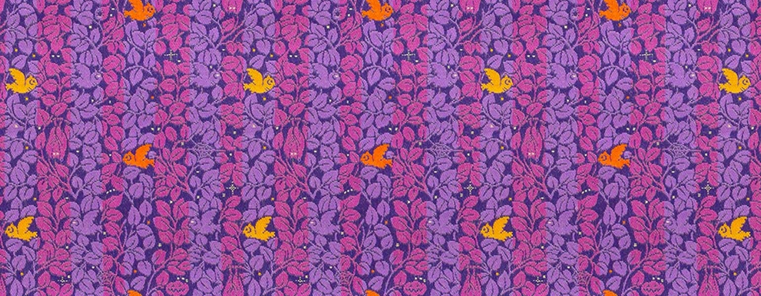 19世紀後半のアーツ・アンド・クラフツ運動の影響を受けた英国の室内装飾用の布を元にしたデザインです。中世の手工芸の復興を目指すこの運動の理念を反映し、フクロウやコウモリ、猫など幸運を象徴する動物たちが葉の間に隠れた、遊び心ある織物となっています。