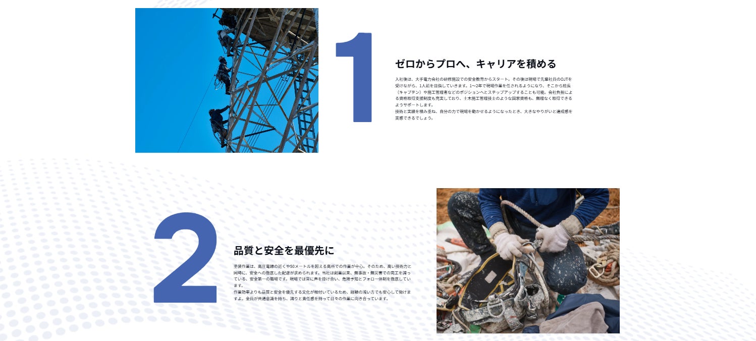 送電鉄塔を中心に、社会インフラを支える“縁の下の力持ち”として長年にわたり防錆塗装・補修を行ってきた平世美装。今回のリニューアルでは、企業としての歩みや想い、そして社会インフラを守る技術力を、よりわかりやすく、そして美しく表現することを目指しました。