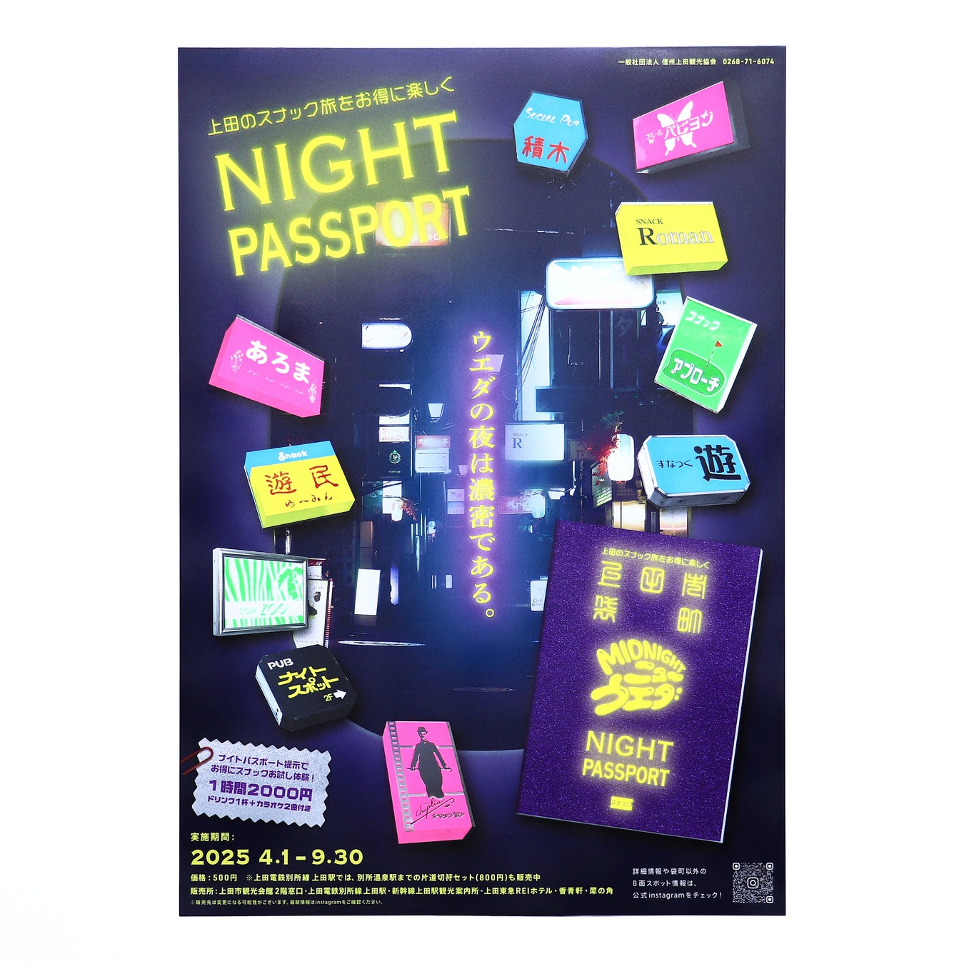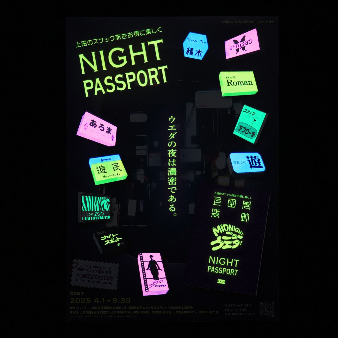 袋町の景観を背景に、ナイトパスポートや参画スナックの看板を印象的に配置した宣伝ポスターを制作。通常版と蓄光版の2パターンあり、蓄光版では夜闇に光るスナック看板をイメージし、ポスター内に配置した看板も暗闇の中で浮かび上がるように光る仕様となっています。期間中、上田駅から袋町へ至る道中などに掲出し、怪しく光る蛍光色が訪れた人をスナックの世界へと誘います。