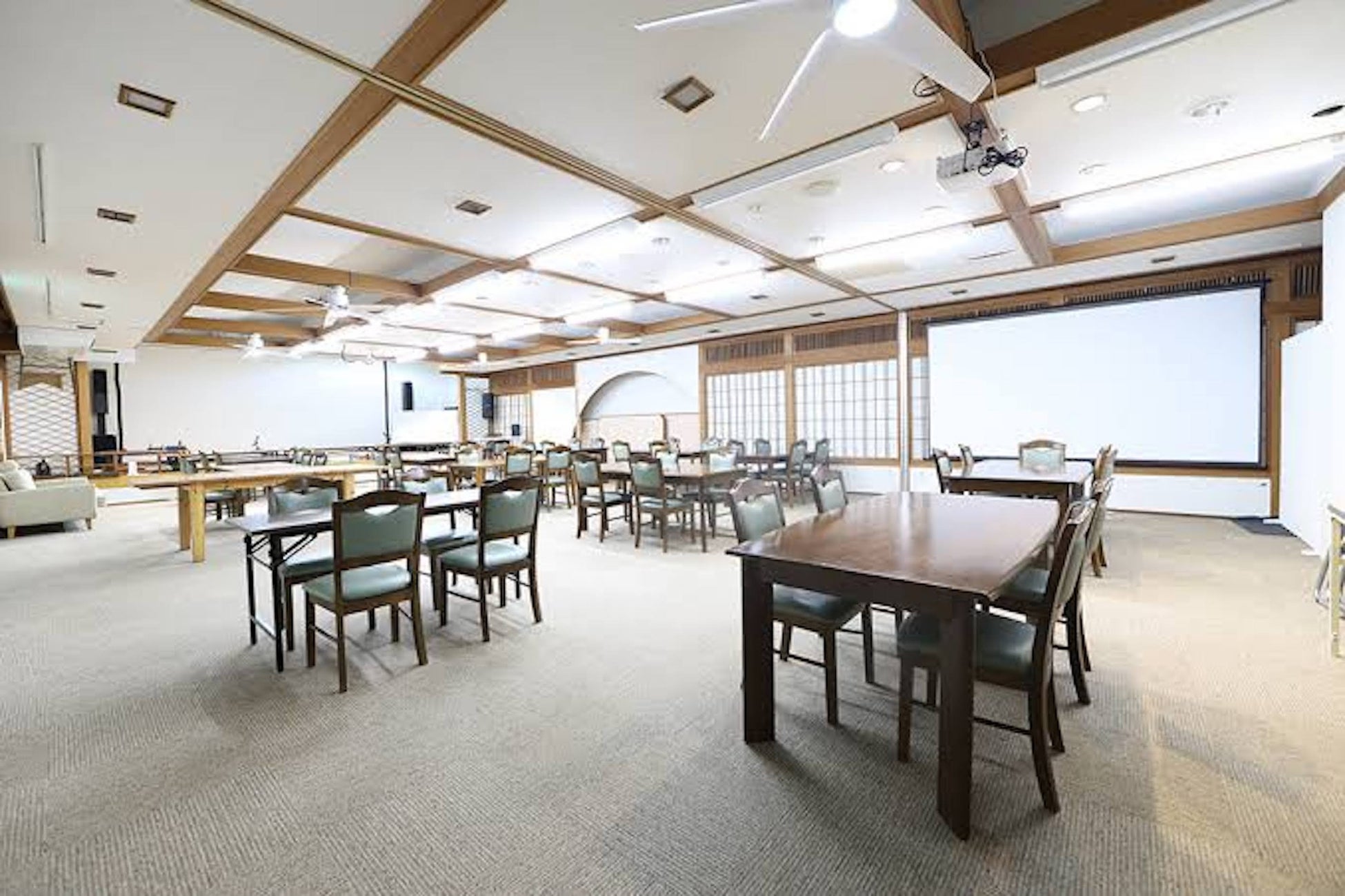 60名程度まで動員可能。会議・プレゼン・ワークショップ・ヨガなどに対応。プロジェクターや大型スクリーン、音響、配信機器、ホワイトボードも完備。