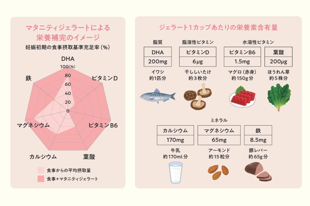 妊娠中や産後は、赤ちゃんの成長と母体の健康維持のため、非妊娠時と比較してより多くの栄養が必要となります。厚生労働省「日本人の食事摂取基準(2025年版)妊婦・授乳婦」及び各学会誌に掲載されている研究データを基に、葉酸・DHA・鉄をはじめとする妊娠中及び産後に特に必要な7つの栄養素をピックアップし、それらについて1日の食事から不足する量をジェラート1カップから補うことができる設計としました。