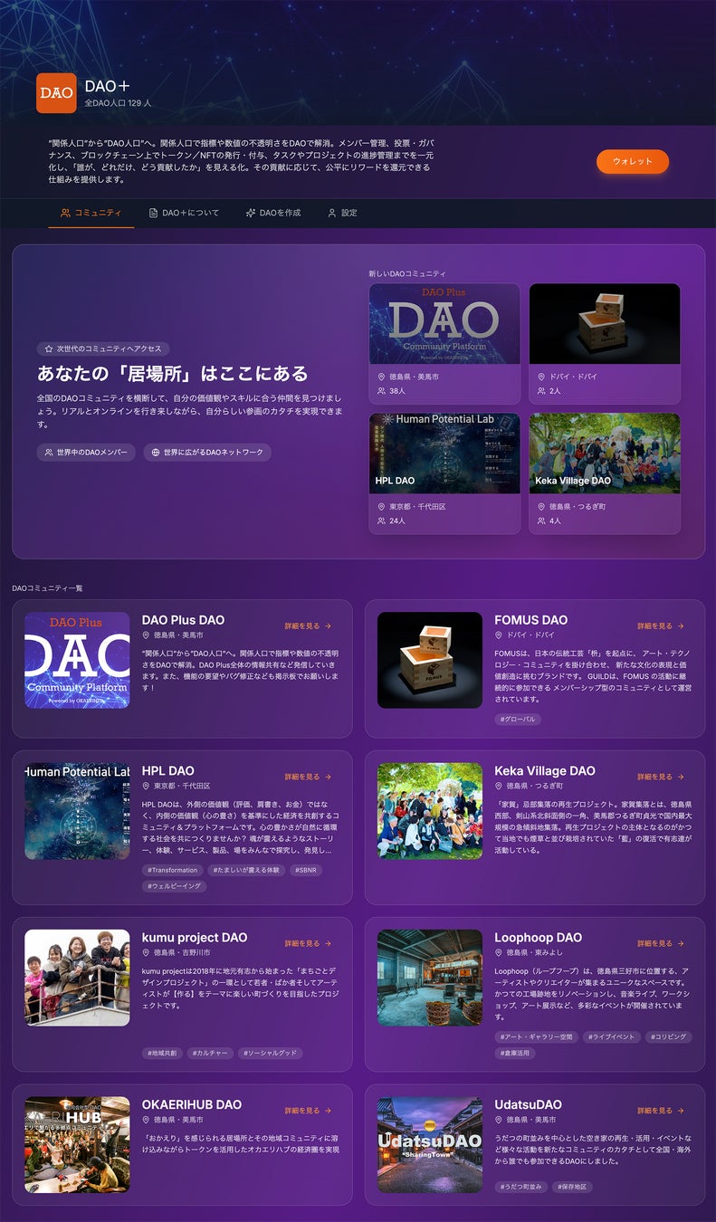 そして、オカエリハブの運営は、新たに開発したDAO運営プラットフォーム『DAO+』で行います。また、『DAO+』を提供開始することで、オカエリハブに参加していないコミュニティや組織でも、『DAO+』を活用してDAO運営の仕組みを構築できるようになりました。
