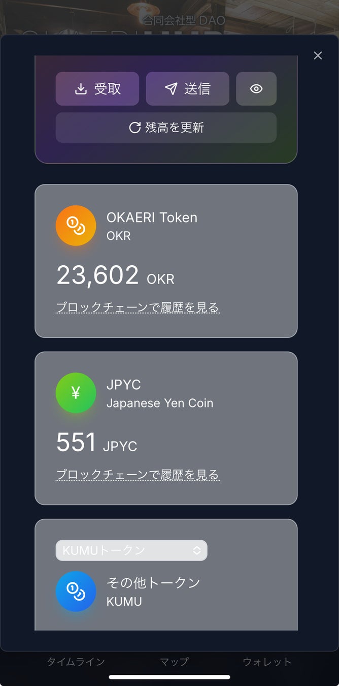 オカエリハブ/DAO+は、参加体験を阻害しないUXを重視したWeb3設計で実装しています。たとえば、ブロックチェーンによる利用権や参加証明の設計をNFT化、貢献に応じたリワード付与(DAOごとに発行する独自トークン)などを整備、加えて、ボタン一つで共通の『DAO+』ウォレット作成やDID(分散型ID)、ガスレス化、各参加DAOのトークン管理など、ユーザーが複雑な手続きを意識せず参加できる仕組みを持っています。また、”DAO+”ウォレットは、デフォルトでステーブルコイン「JPYC」も導入しており、全国のJPYC決済を導入している施設やお店、サービスなどでご利用になれます。