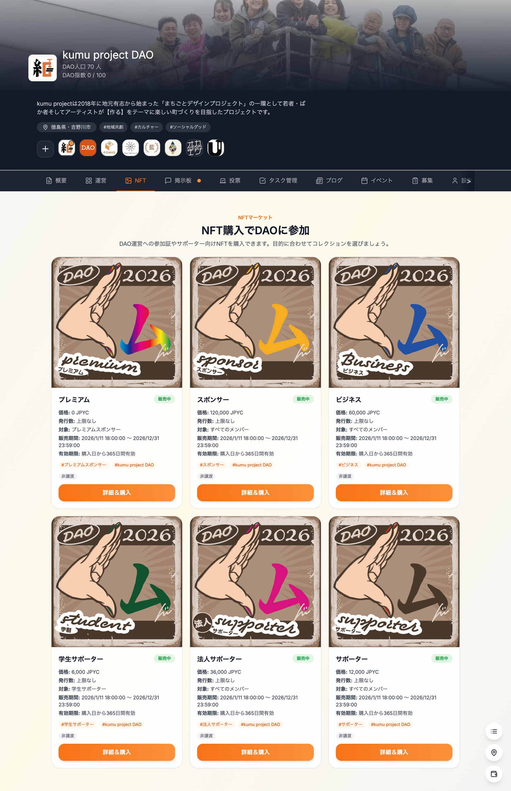 ・会費の一部を原資とした地域プロジェクトへの参画:多拠点会員(一般)から集まった会費の一部を原資に、翌年度に実施する地域プロジェクト(例:空き家再生、イベント企画・運営、地域環境の整備等)を、DAOで企画・投票・実行します。宿泊施設オーナーは、地域の課題や拠点の状況を踏まえた企画提案や合意形成に参加でき、プロジェクトの実行にも関わることができます。