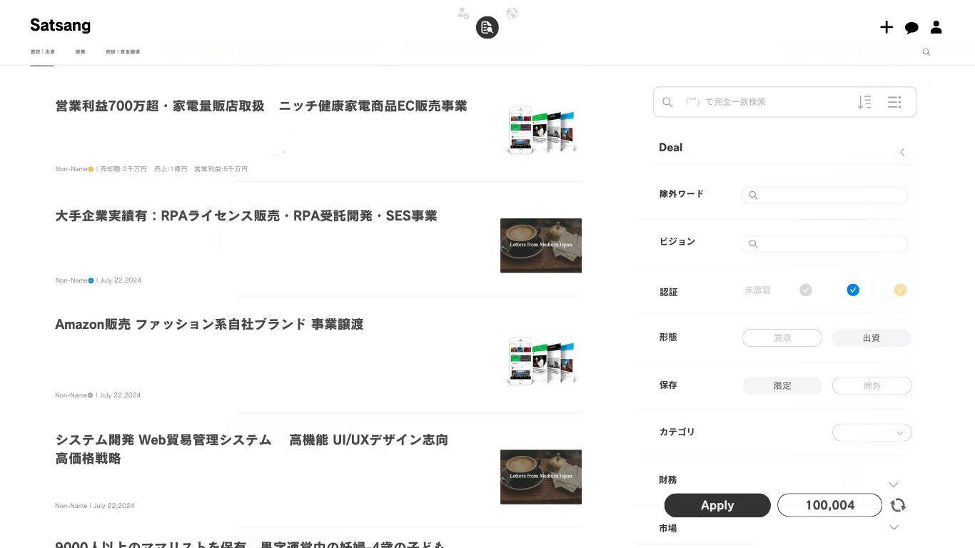 M&A YOUTH合同会社(本社:東京都中央区、代表:田中一希)は、M&A・業務提携・資金調達など、企業間取引における案件マッチングを提供するWeb3型ディールプラットフォーム「Satsang(サットサン)」を先行公開いたしました。