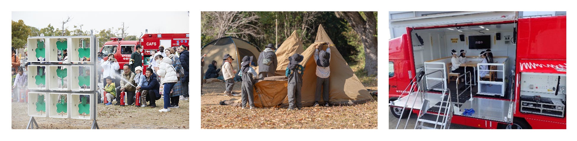 消火器による的あてゲーム、ジャッキを使った救出体験など、親子で楽しく学べる防災プログラムが大集合。