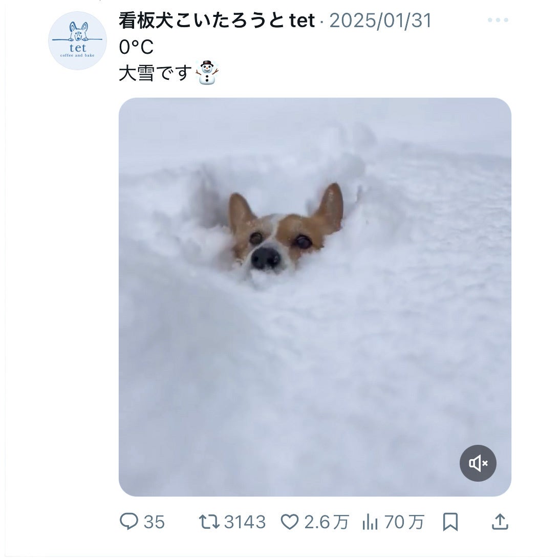 コーギーモチーフのスイーツをつくるきっかけは看板犬コーギーのこいたろうの存在。こいたろうが大雪の中を進む姿を収めたショート動画はX(旧Twitter)で2万件以上のいいねを集め、ネットニュースにも取り上げられるなど話題となりました。(看板犬こいたろうとtet @tet_coffeebake)