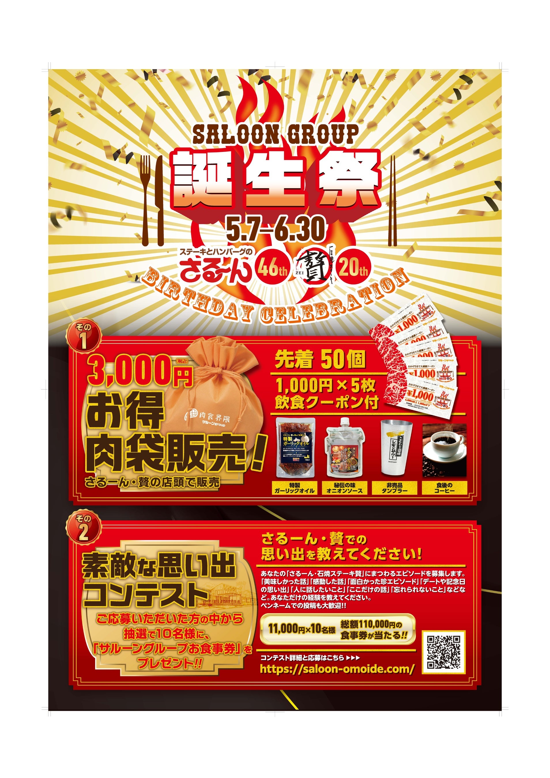 サルーングループ誕生祭”開催!46周年&20周年の感謝を込め皆さまの素敵な記憶を、未来へつなぐキャンペーン〜あの日のステーキの味、家族の笑顔、忘れられないひとときをもう一度〜