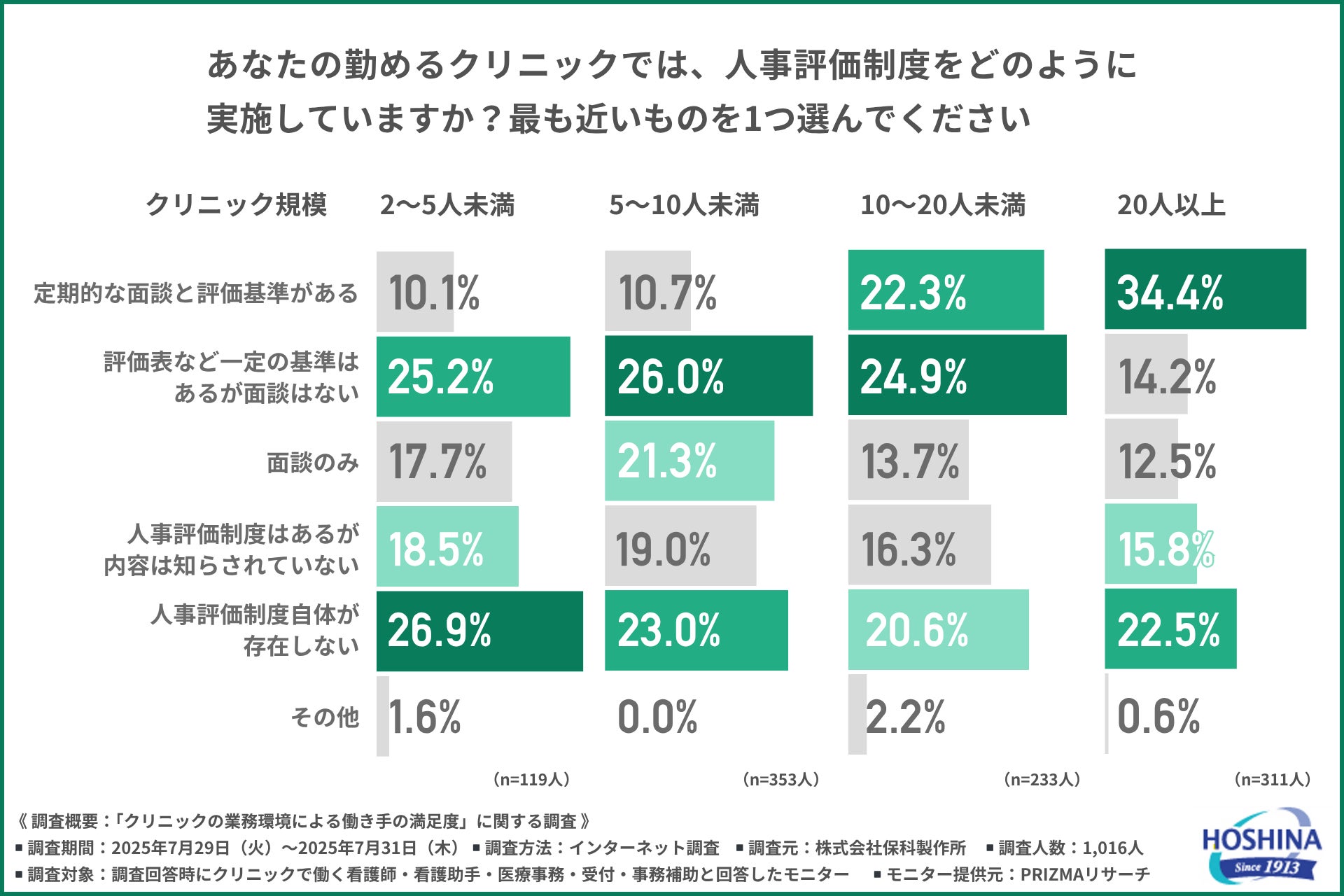 クリニックの規模が大きくなるほど、人事評価制度が「面談+評価基準」の形で明確に整備されていることがわかります。