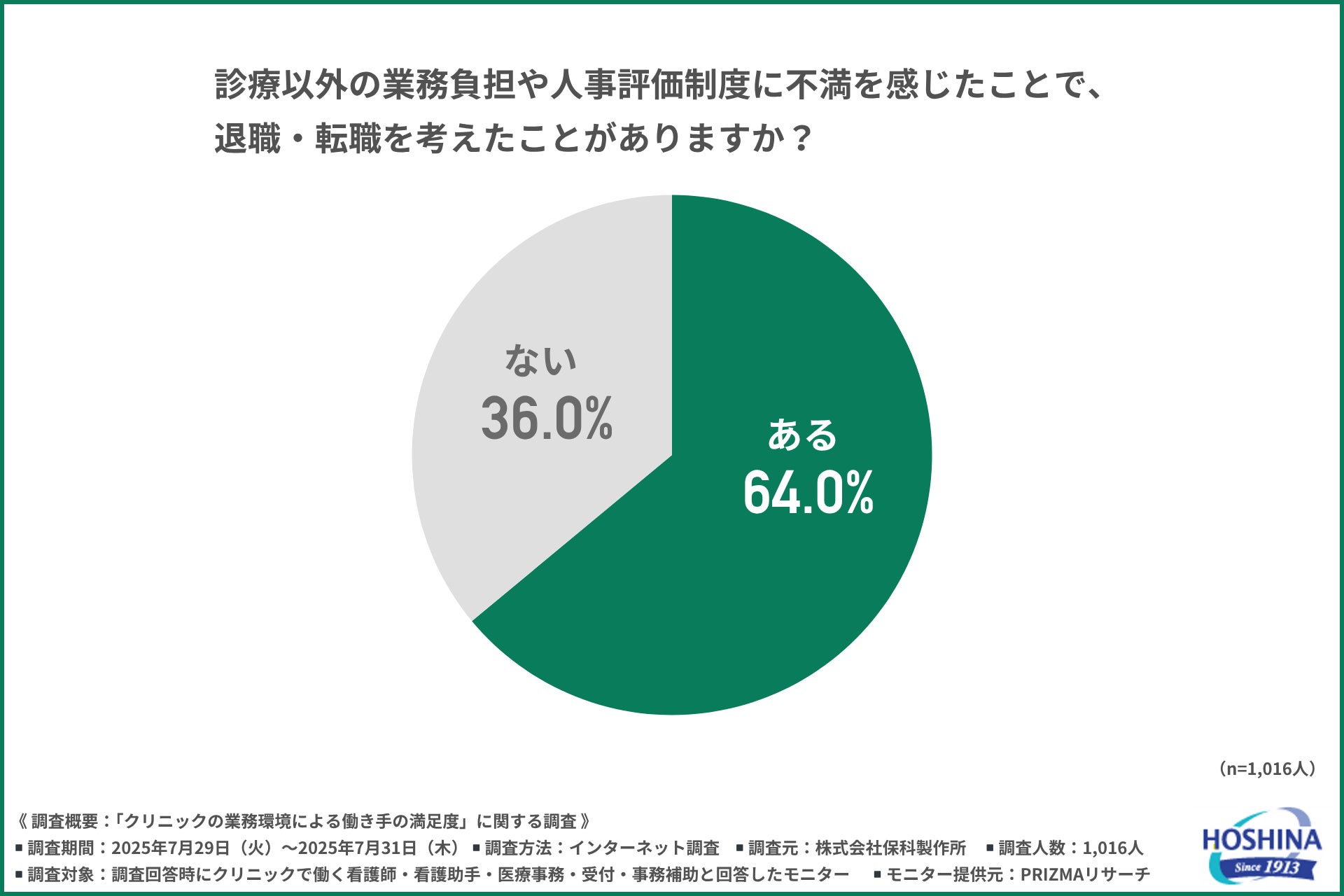 「診療以外の業務負担や人事評価制度に不満を感じたことで、退職・転職を考えたことがあるか」と尋ねたところ、約6割が『ある(64.0%)』と回答しました。