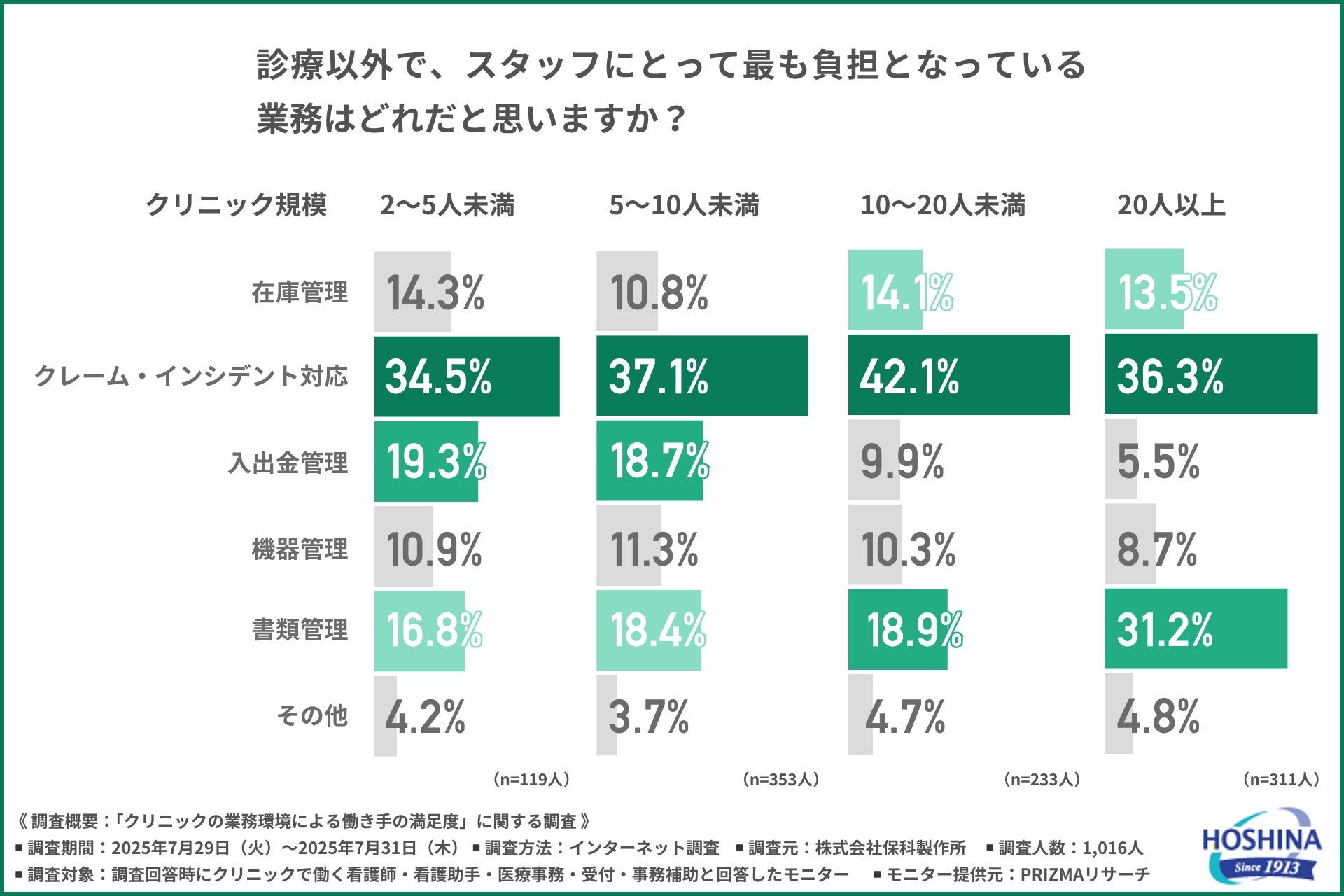 「診療以外で、スタッフにとって最も負担となっている業務」について、クリニックの規模別に尋ねたところ、以下のような回答結果になりました。