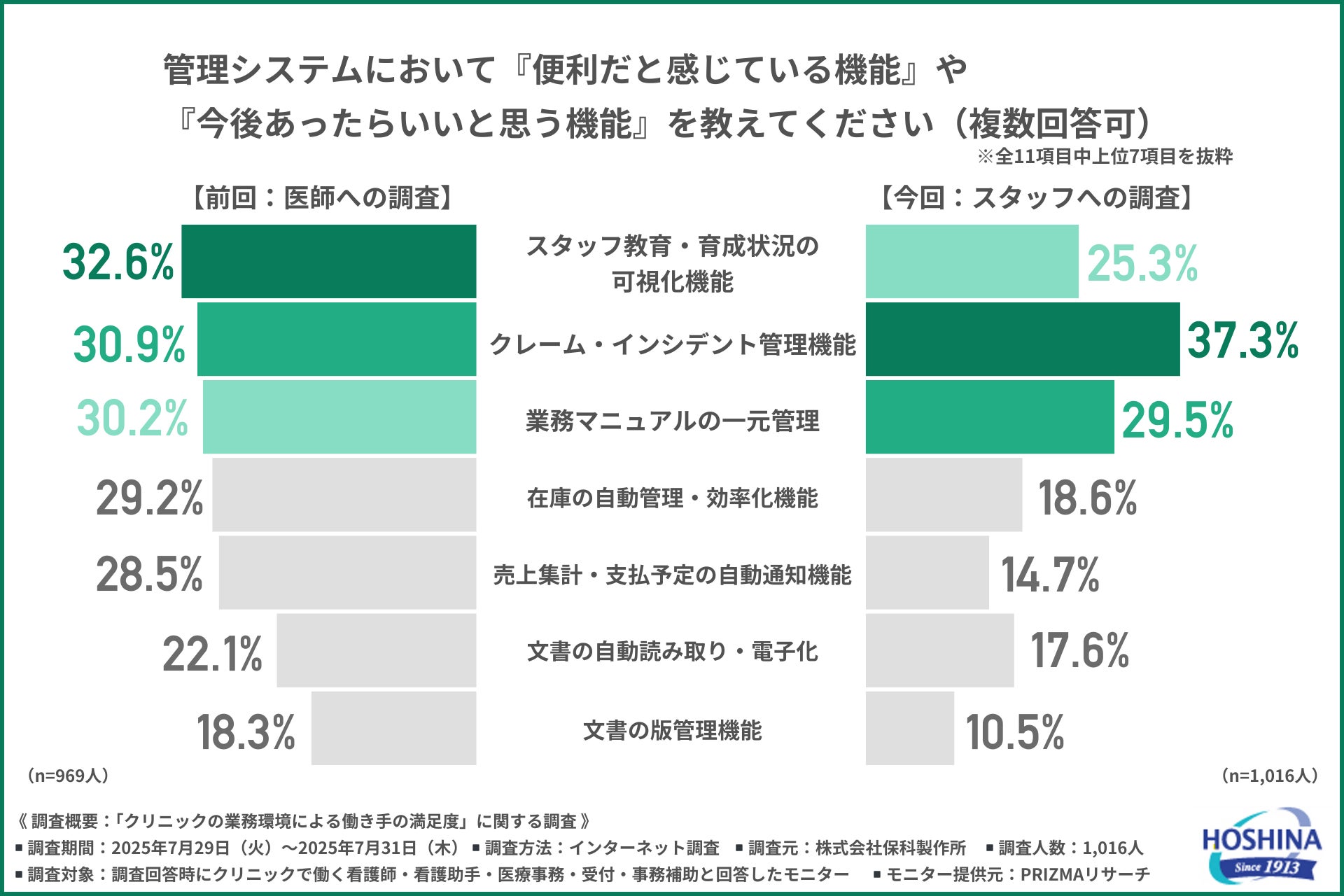 また、『業務マニュアルの一元管理』は前回と同様に一定のニーズがあり、業務の属人化に対して、医師もスタッフも課題を感じていることが浮き彫りになりました。