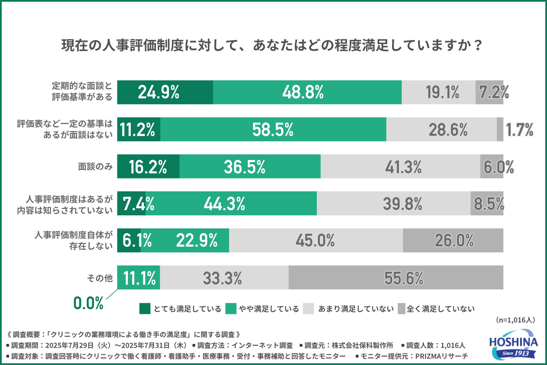 評価基準があり面談も実施されている職場では「満足している」との回答が多かった反面、「人事評価制度の内容が知らされていない」「存在していない」といった職場では不満の声が目立ち、人事評価制度の有無が職場満足度に直結していることが浮き彫りになりました。