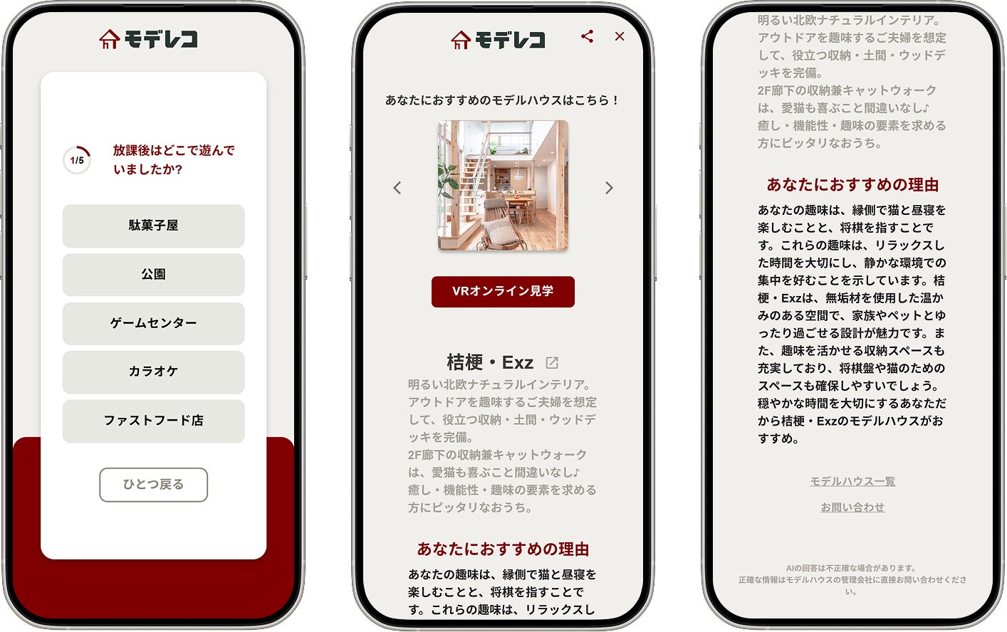 「モデレコ」は、AI技術を駆使してユーザー一人ひとりに最適なモデルハウスを提案する革新的なアプリケーションです。「モデレコ」の主な特徴は以下の3点です。