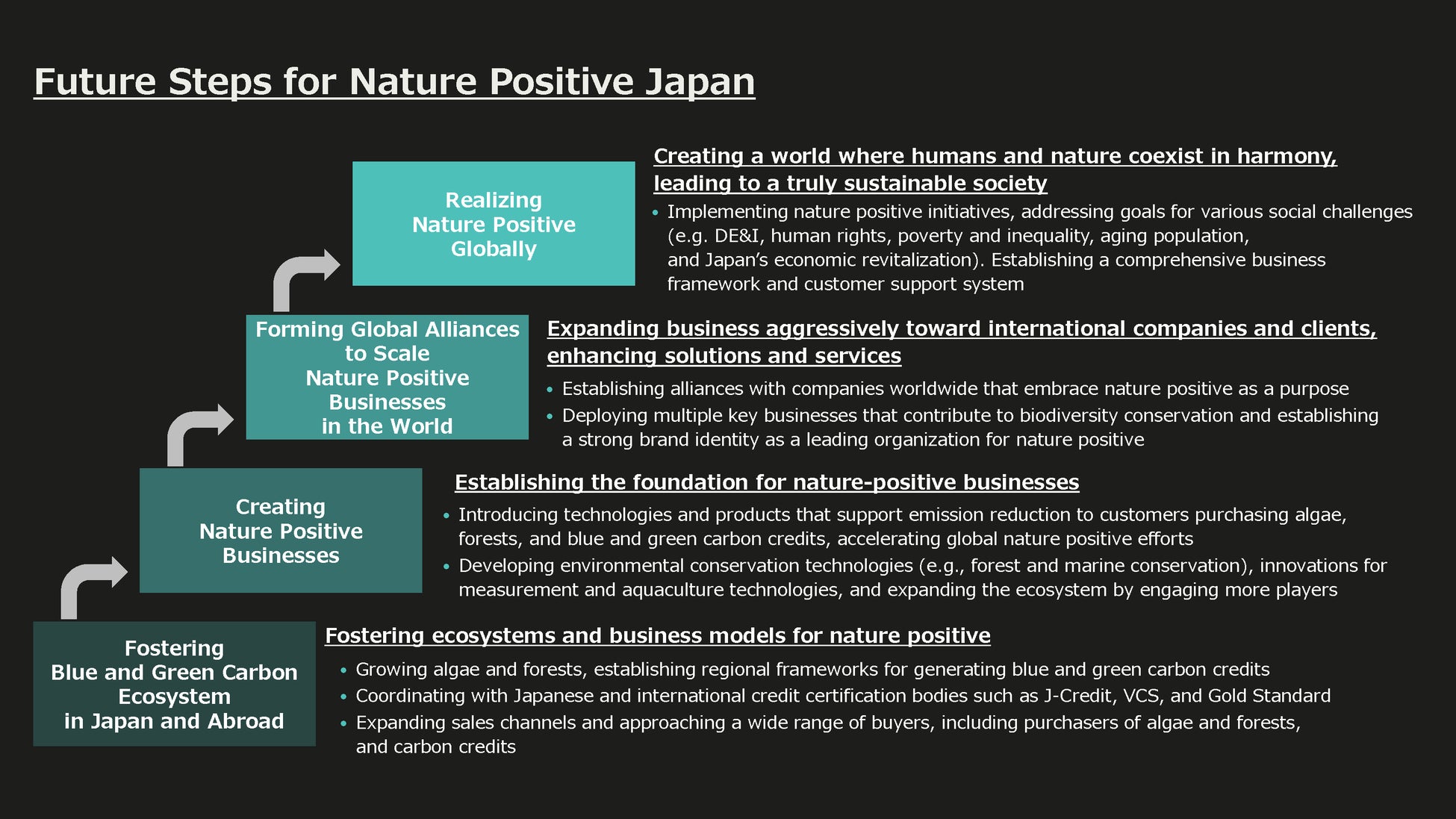 Through businesses driven by Nature Positive concept, our Company aims to establish a new market worth one trillion yen (seven (7) billion USD), both in Japan and abroad, while providing sustainable value to the environment and society. Going forward, we will continue to proactively develop business activities aimed at realizing a sustainable society in harmony with nature.