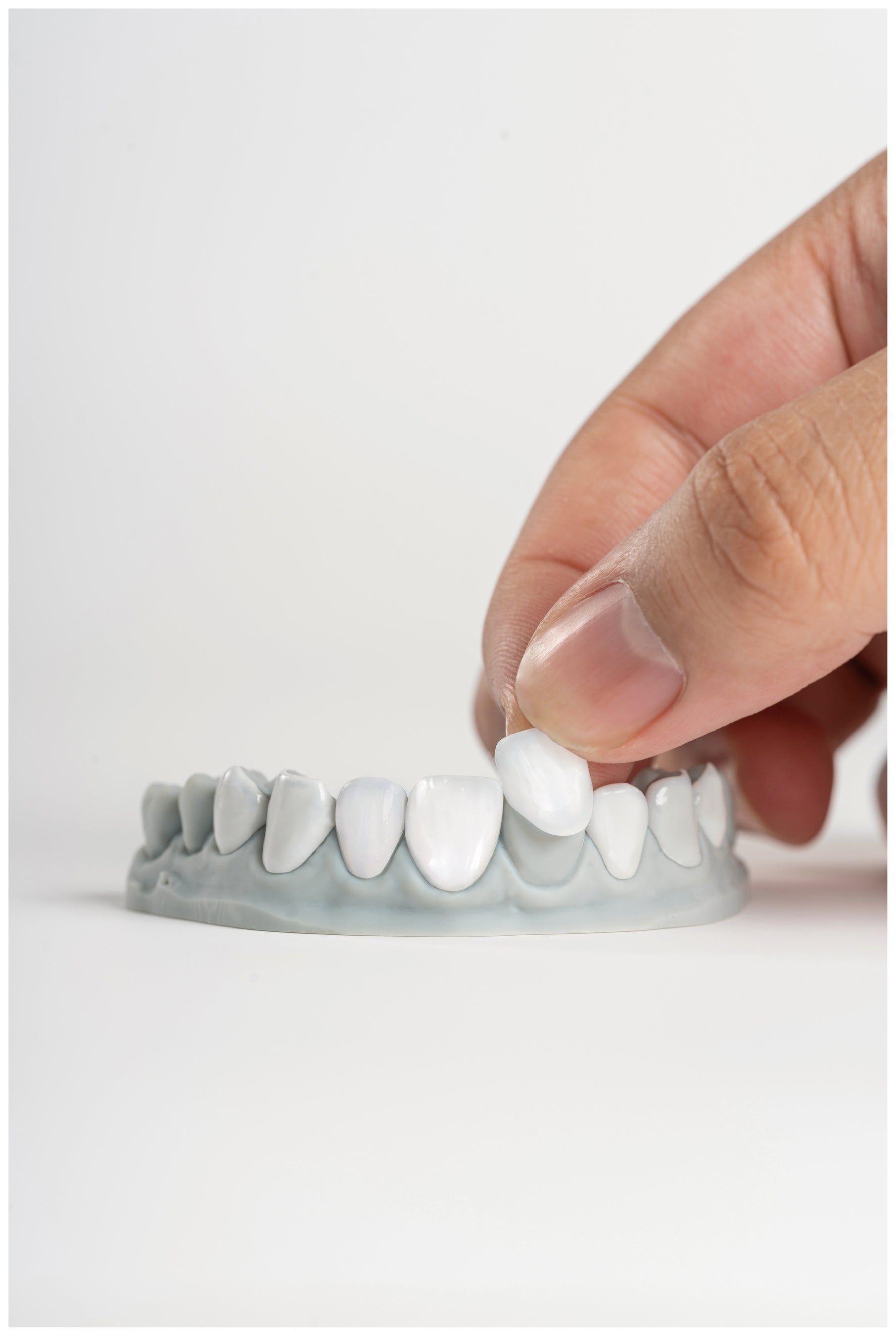 従来のジルコニアべニアは、その美しさの裏に「時間」「コスト」「均一性」といった課題を抱えていた。熟練の技工士が一枚ずつ手作業で製作するため、再現性や生産効率には限界があったのだ。
