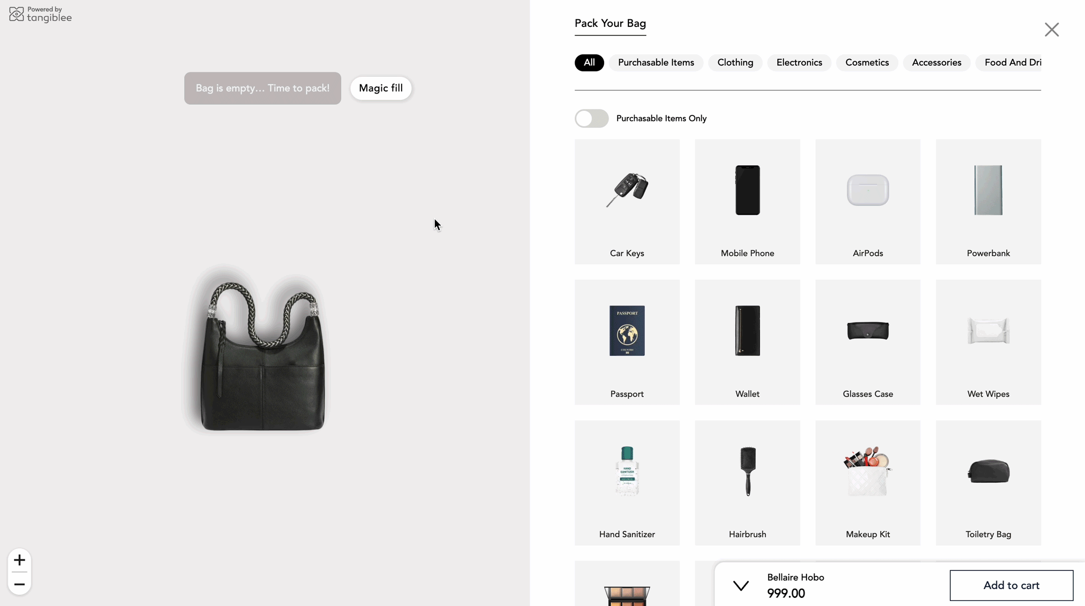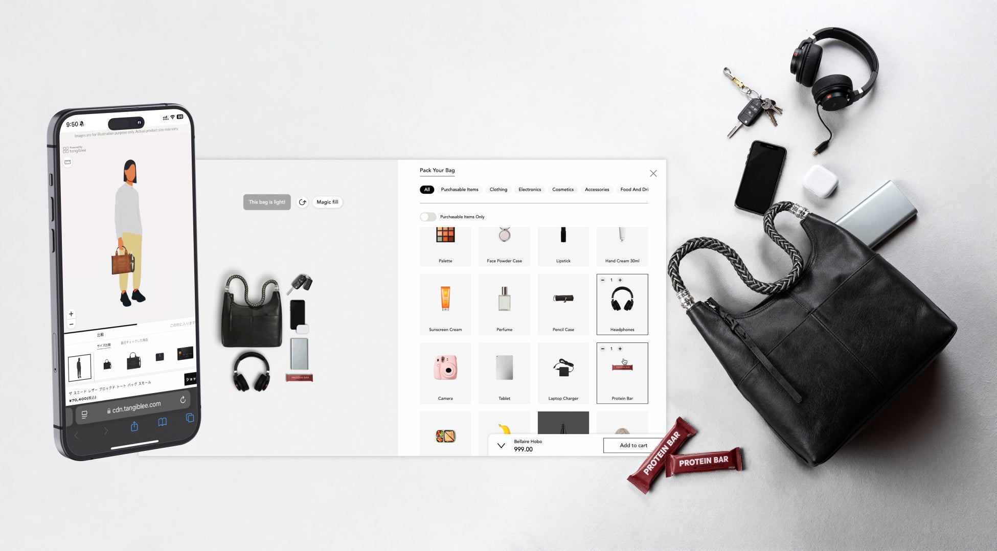 購入者がアイテムをドラッグ&ドロップしてバッグに追加できるインタラクティブ機能。さらに「マジックフィル」で自動的に日常品を詰めることも可能。クロスセルを促進し、平均注文額(AOV)の向上にも寄与します。