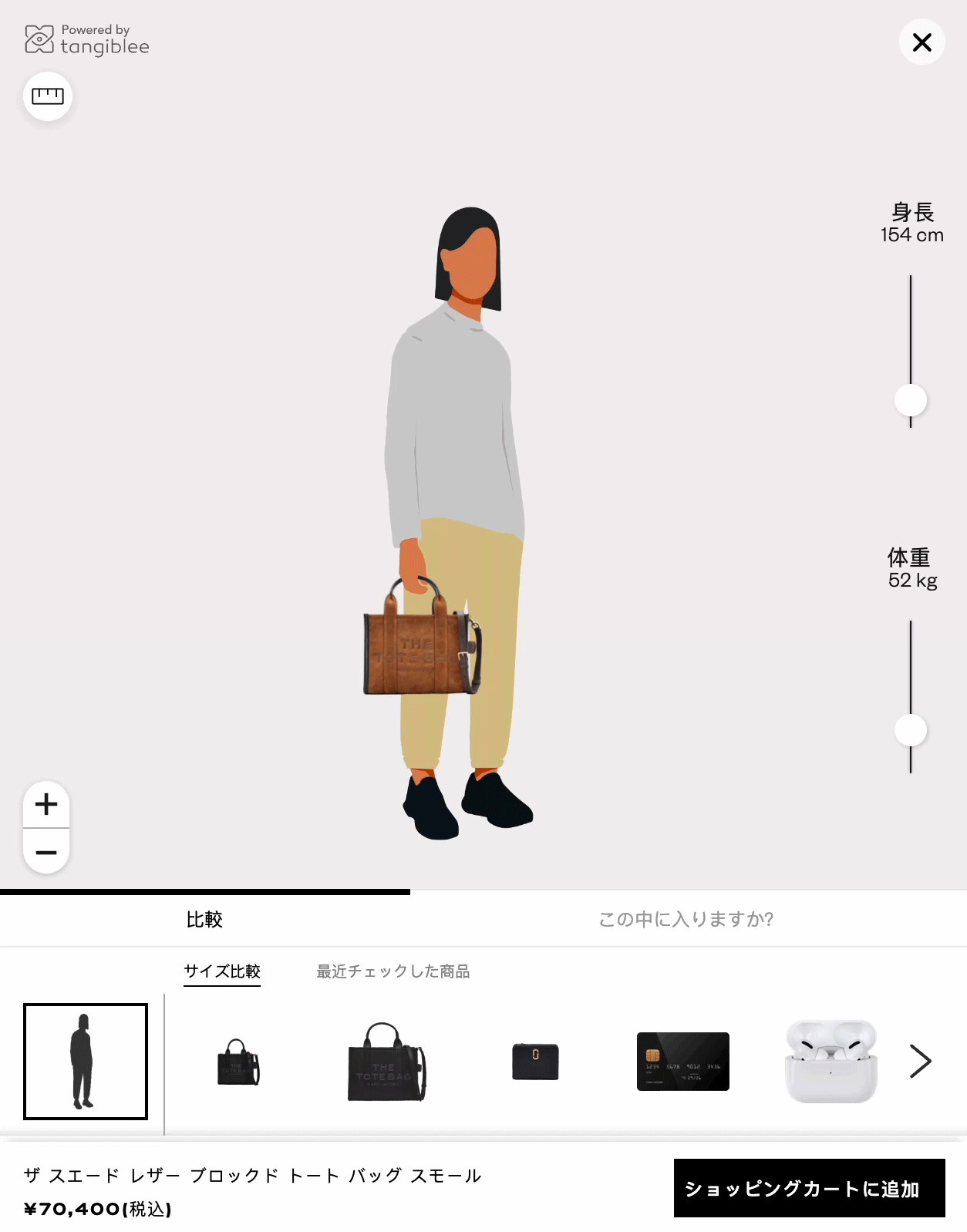 購入者が自分の身長・体型に合わせてバッグの見え方を確認できる機能。ストラップの長さや落ち感を可視化し、「思ったより大きかった」という不満を防ぎます。