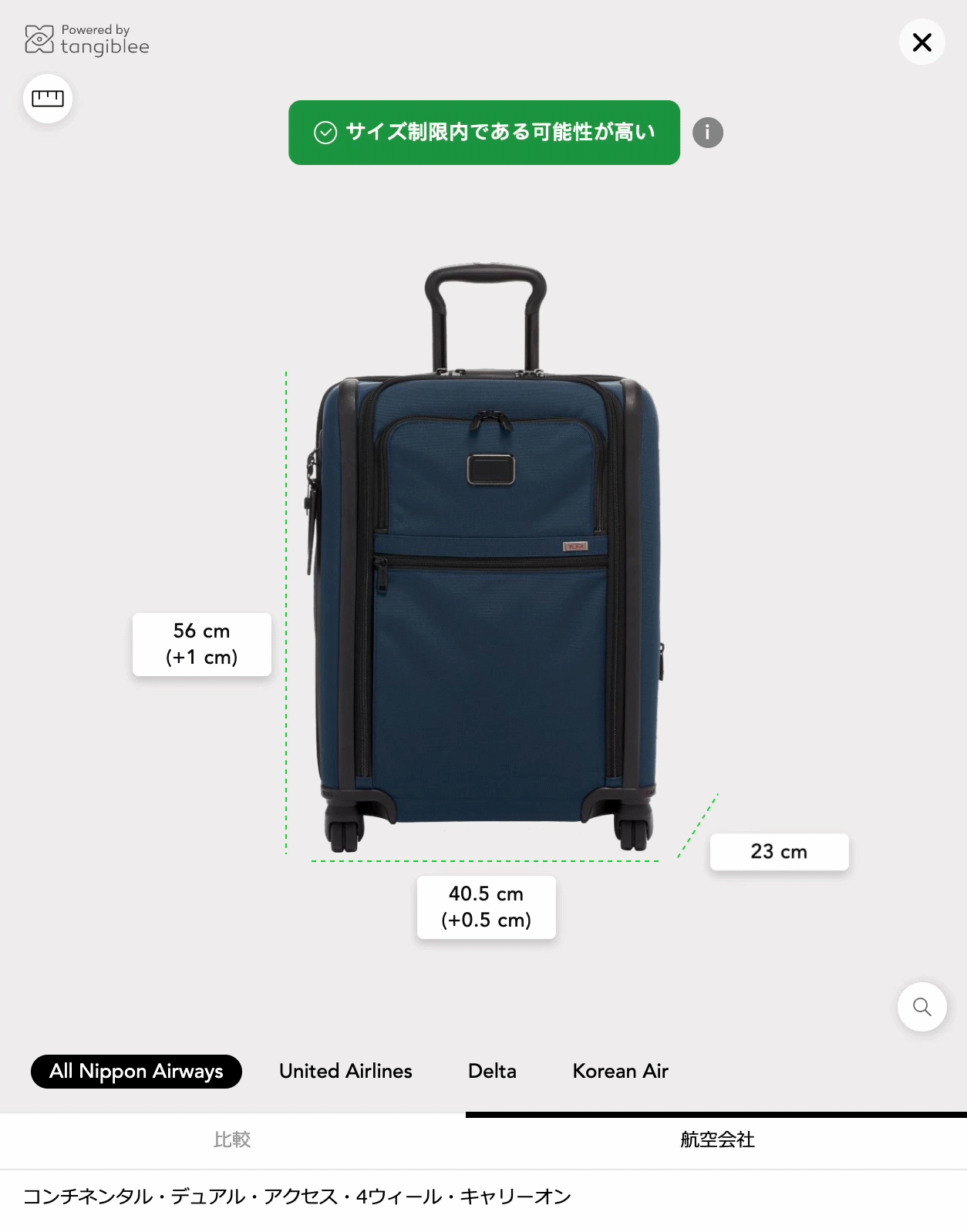 利用する航空会社を選ぶだけで、バッグが機内持ち込みサイズに収まるか即座に判定。公式ポリシーへのリンクも表示され、透明性の高い購買体験を提供します。