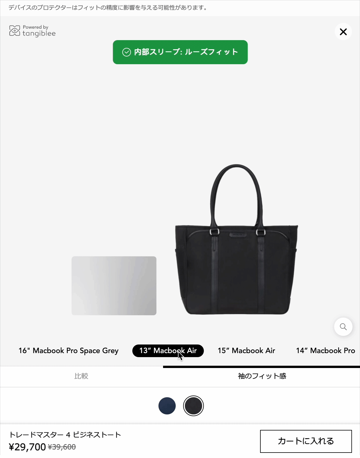 ノートPCやタブレットがバッグに入るかを即座に判定。モデルやインチ数を選択するだけで「ぴったり」「ゆとりあり」「入らない」を表示します。