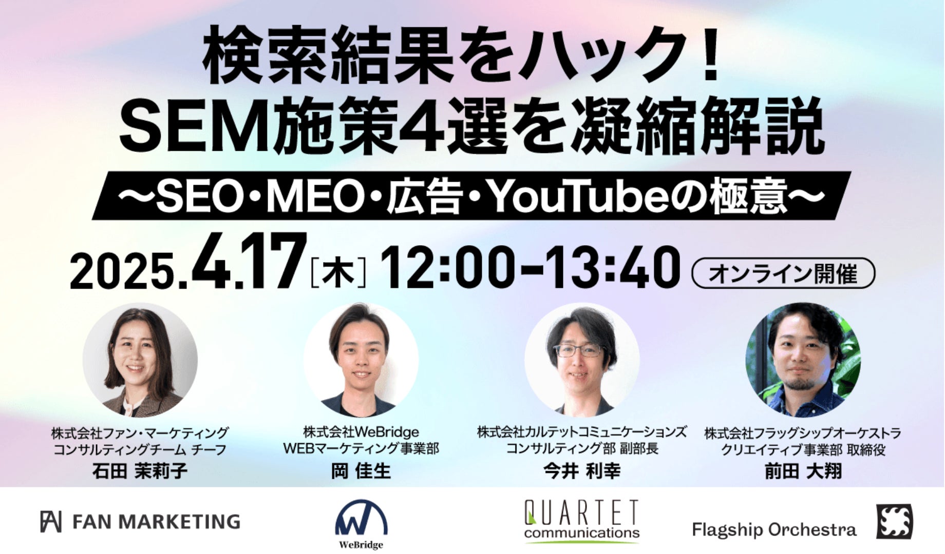 今回は、「SEM(サーチエンジンマーケティング)」にフォーカス。検索エンジンからの集客は、Webマーケティングにおいて必須です。近年は、Googleのアップデートに伴い、ユーザーが触れる検索結果の種類も多様化しているため、複数の施策に総合的に取り組むことが成果の最大化につながります。そこで今回は、主要な4施策(コンテンツSEO、リスティング広告、MEO、YouTube動画)を得意とする4社が集結!各社が培ったノウハウを知って、検索結果をハックしましょう!
