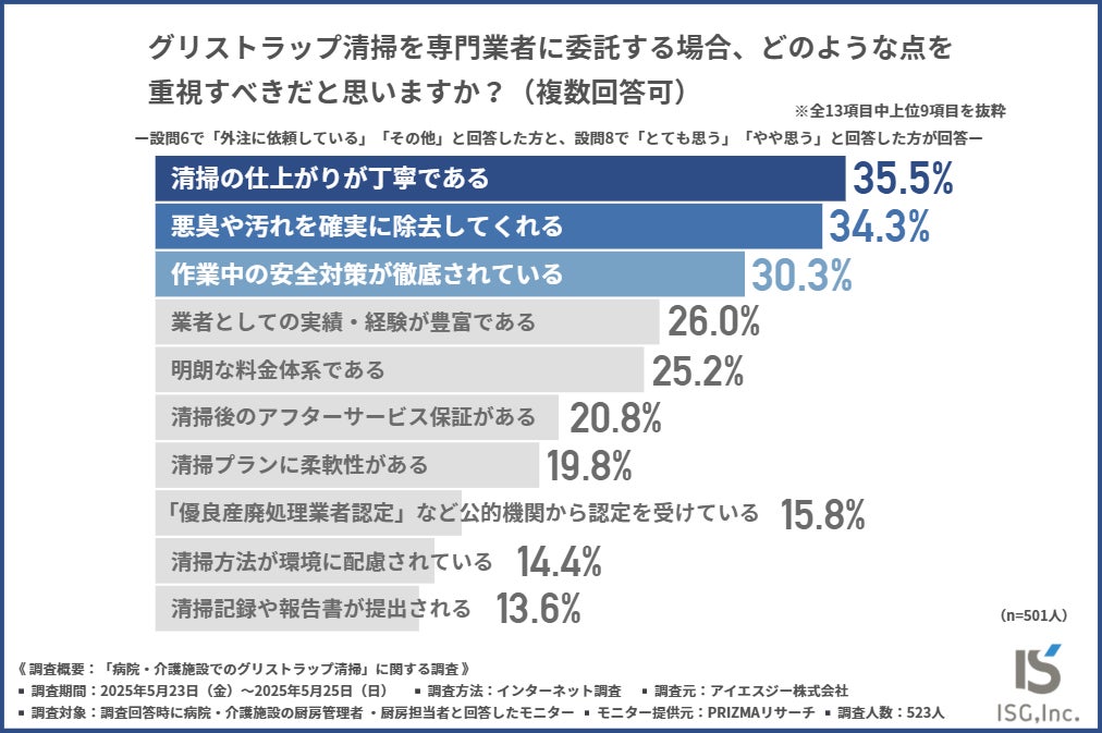最後に、「グリストラップ清掃を専門業者に委託する場合に重視すべき点」について尋ねたところ、『清掃の仕上がりが丁寧である(35.5%)』『悪臭や汚れを確実に除去してくれる(34.3%)』『作業中の安全対策が徹底されている(30.3%)』が上位を占めました。