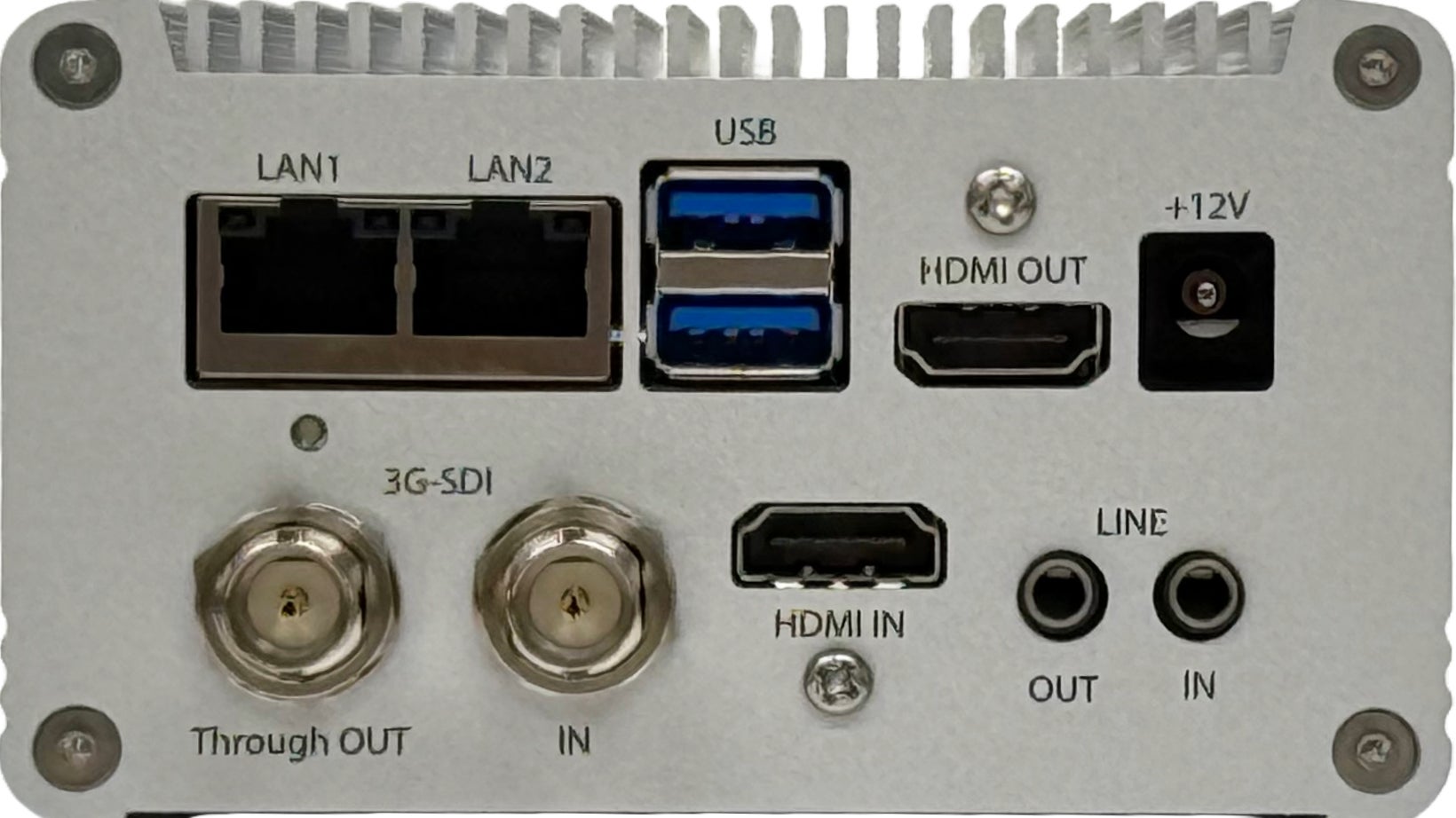 3G-SDI 入力 x 1ch, 3G-SDI スルー出力 x 1ch HDMI 入力 x 1ch, HDMI モニタ出力 x 1ch LINE 音声入出力 x 各1ch LAN(10Base-T, 100Base-TX, 1000Base-T) x 2ch USB3.2 x 2ch, システムコンソール |